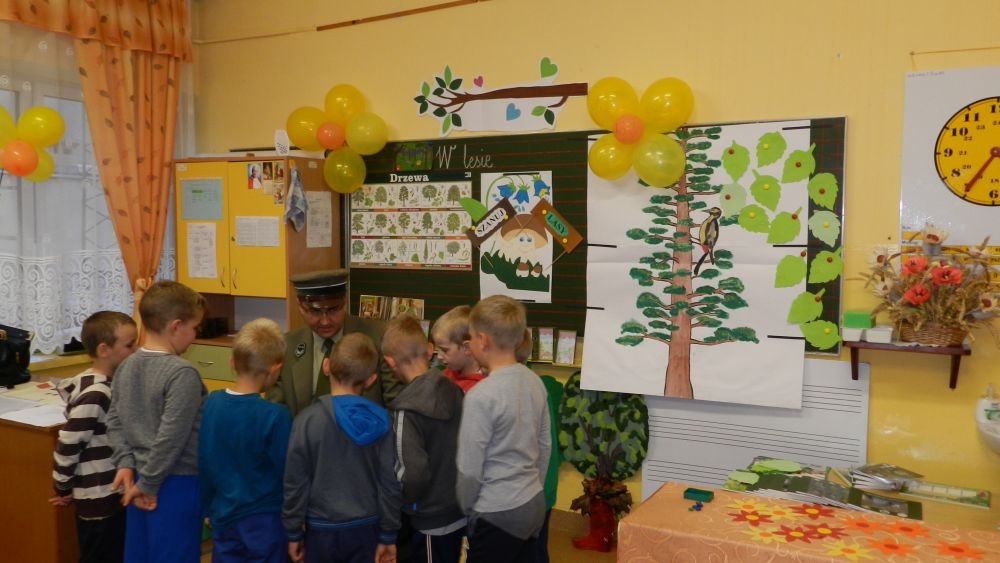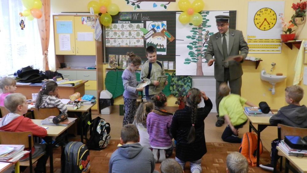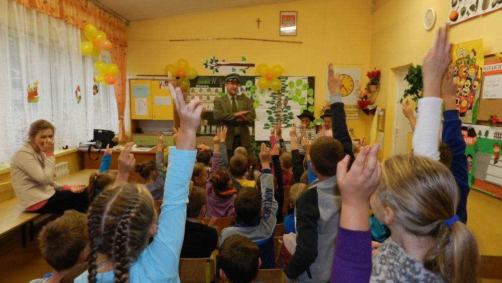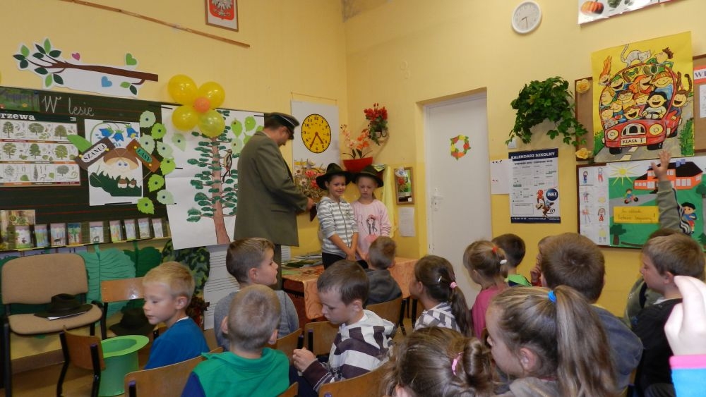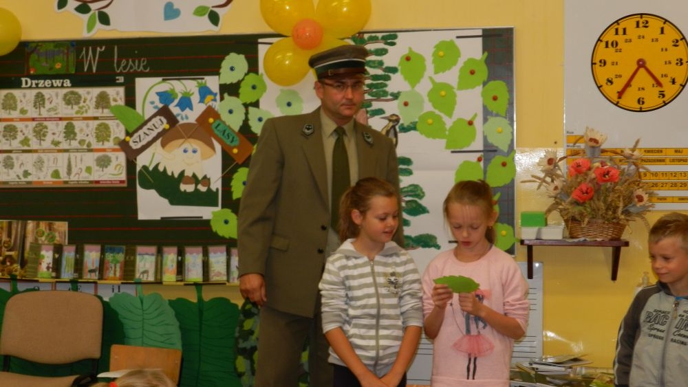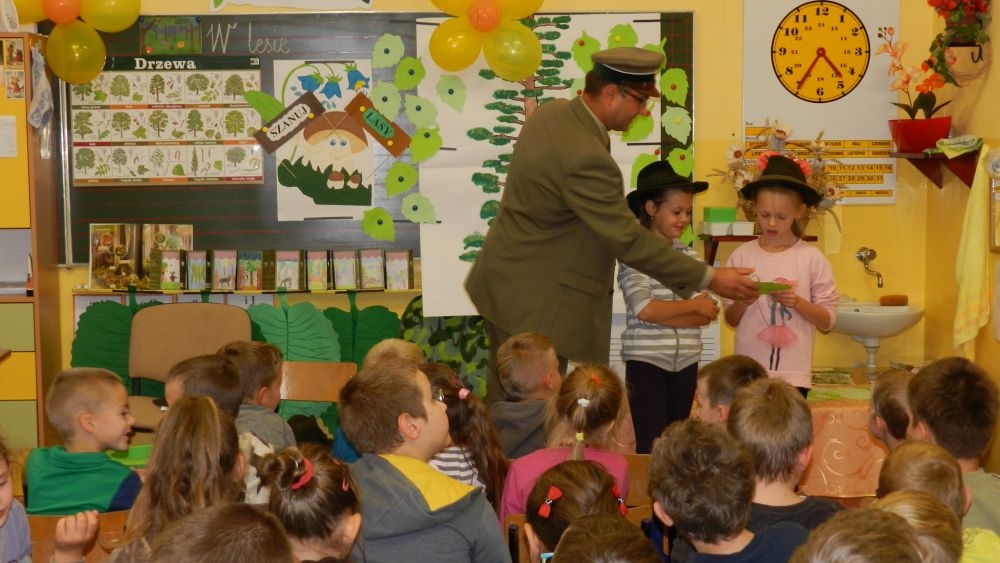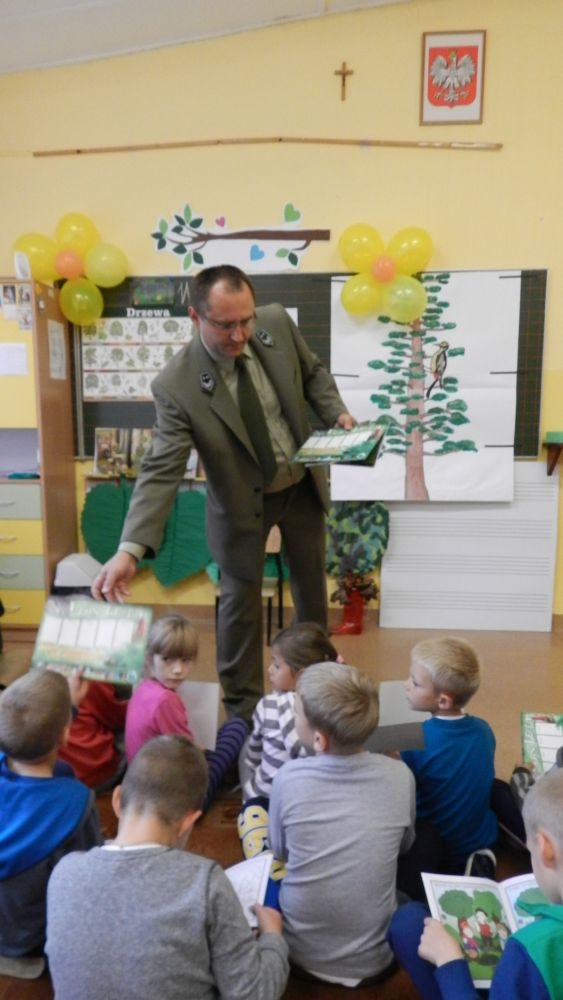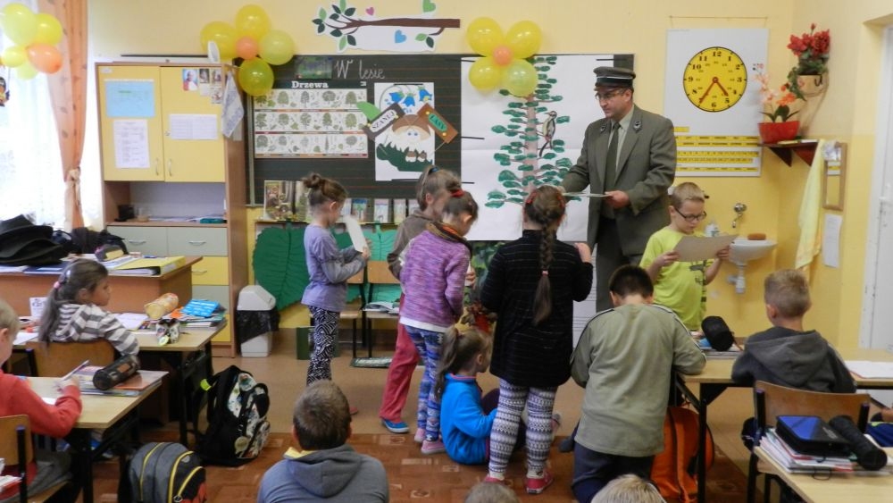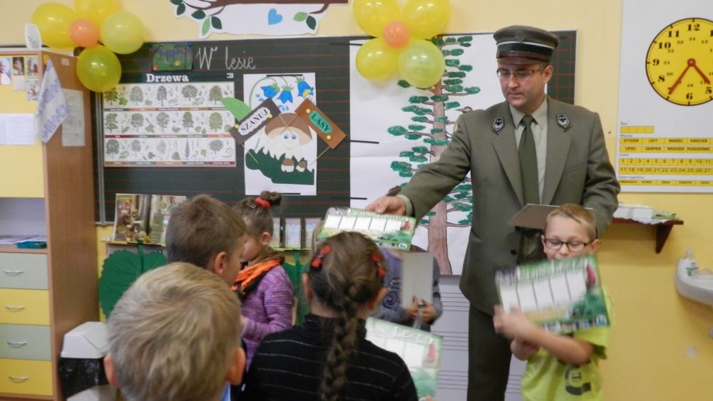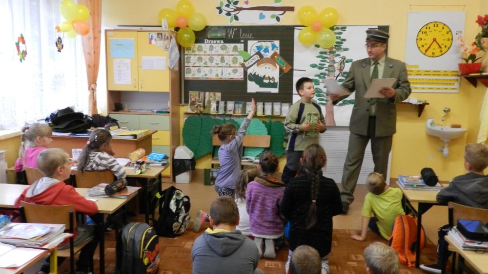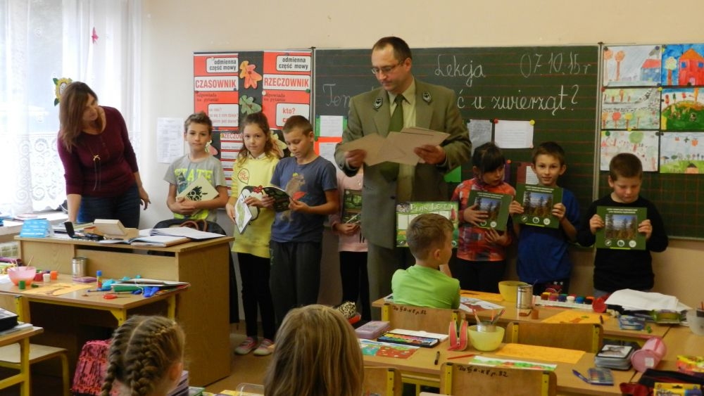 W październikowy poranek do szkoły w Kosarzyskach zawitał leśnik- Roman Rams. Wprowadził On uczniów klas I, II, III w świat tajników nadpopradzkiej przyrody, bliskiej dzieciom ze względu na zamieszkanie, ale jeszcze nie do końca zgłębionej przez małych przyrodników. Pan Roman Rams opowiedział dzieciom o lesie, jego walorach przyrodniczych, korzyściach jakie niesie dla człowieka i innych organizmów żywych. W pogadankę aktywnie angażowali się uczniowie, na żywo zadając pytania lub udzielając odpowiedzi na leśne zagadki. Kiedy dzieci zapoznały się z walorami lasu i umiały wyjaśnić, co znaczy, że „las jest przyjacielem człowieka”, przyszedł czas, by zastanowić się, co my ludzie, możemy uczynić, by odwdzięczyć się przyrodzie, lasowi za okazywane dobra i korzyści, jakie czerpiemy za jego pośrednictwem . Dzieci jednomyślnie stwierdziły, że chcą i będą przyjaciółmi lasu i wiedzą już, jak to zrobić. Po przeprowadzeniu zajęć edukacyjnych, dzieci wzięły udział w konkursach. Dla uczniów klasy I i II leśnik przygotował pytania w formie zagadek, które ukryte były na odwrocie kwiatów i jesiennych liści. Maluchy radziły sobie wyśmienicie z rymowanymi zagadkami. Dla dzieci starszych został przygotowany pisemny quiz, z trudniejszymi pytaniami. By złapać przysłowiowy i dosłowny oddech, uczniowie wyruszyli na zajęcia w terenie. Warsztaty leśne dały możliwość poznania etapów powstawania lasu i poznania trudu, jaki trzeba włożyć w to, by ludzie mogli korzystać i cieszyć się jego wieloaspektowymi walorami. Na spotkaniu w terenie, dzieci wielozmysłowo poznawały las, poprzez dotyk, węch, słuch i wzrokowe podziwianie przyrody. Uczniowie rozróżniali także gatunki drzew po ich korze, liściach i owocach. Poprzez leśne poszukiwania, pogadanki, pytania i odpowiedzi uczniowie zrozumieli sens cyklu powstawania lasu : „od nasionka do nasionka”. Po terenowych wojażach uczniowie powrócili do szkoły, gdzie ogłoszone zostały wyniki przeprowadzonych konkursów przyrodniczych. Ci najlepsi zostali uhonorowani nagrodami książkowymi, kolorowankami, notesami i gadżetami, przekazanymi przez Nadleśnictwo Piwniczna. Również nasz leśny edukator- Roman Rams został nagrodzony przez dzieci gromkimi brawami oraz własnoręcznie przygotowanymi „oknami na las”- które po rozchyleniu okiennic skrywały piękne krajobrazy naszej okolicy.