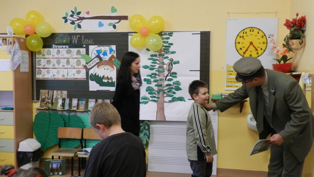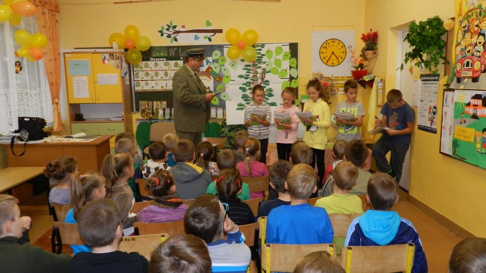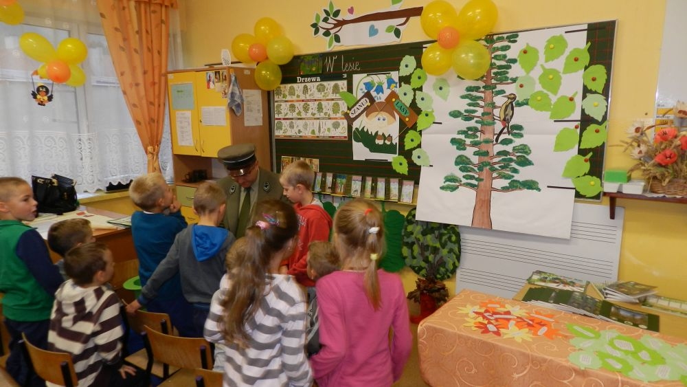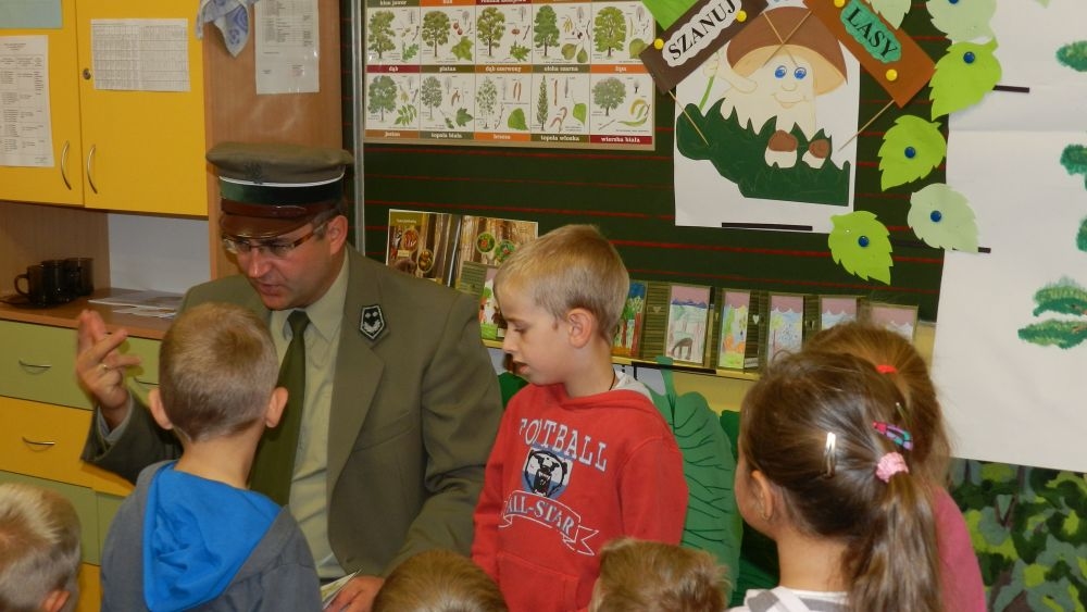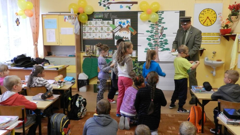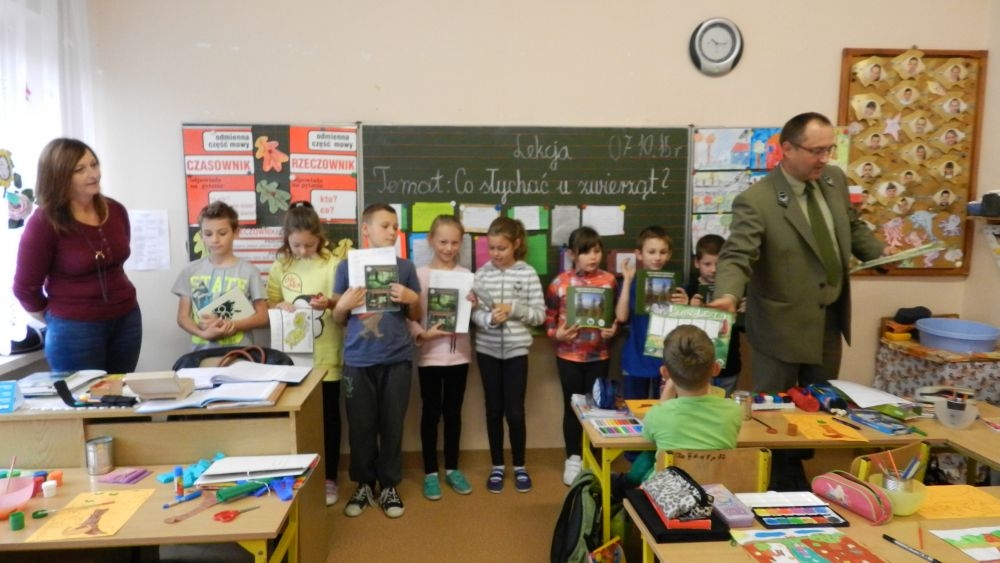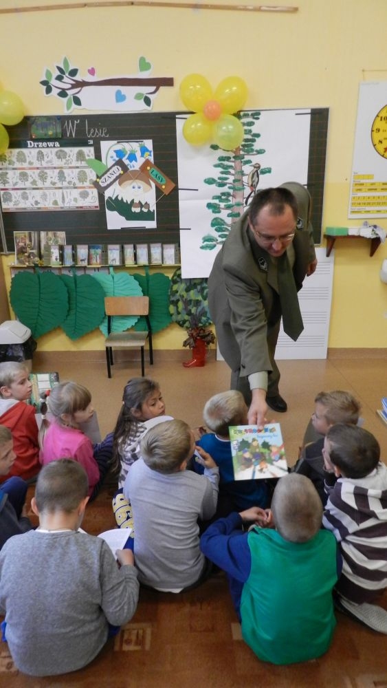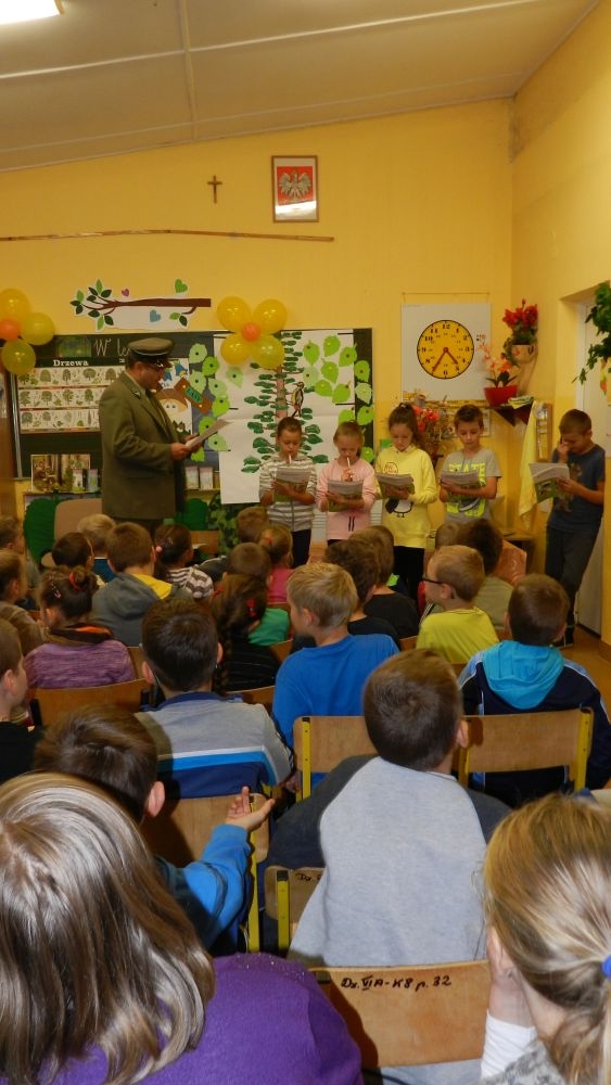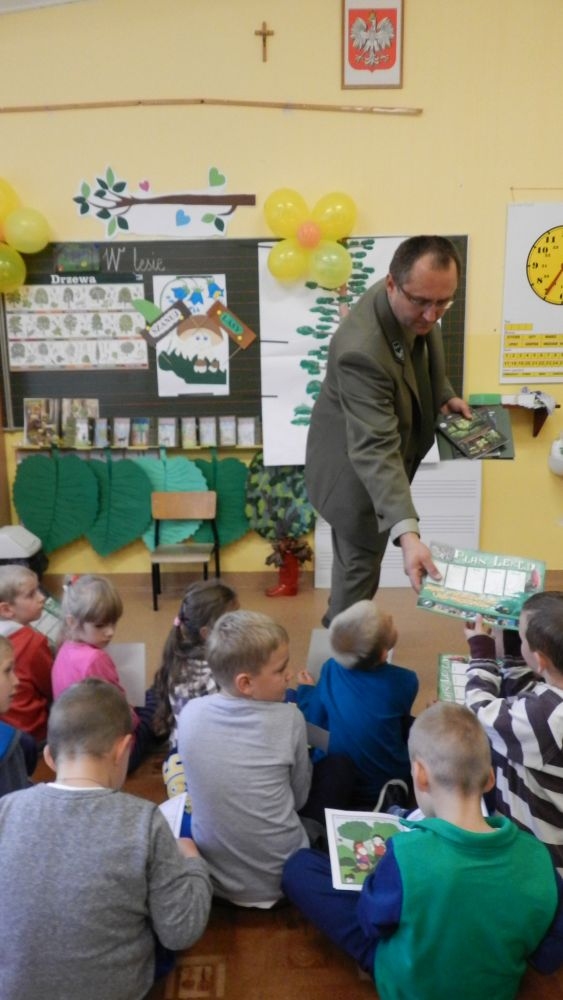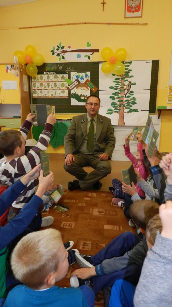 W październikowy poranek do szkoły w Kosarzyskach zawitał leśnik- Roman Rams. Wprowadził On uczniów klas I, II, III w świat tajników nadpopradzkiej przyrody, bliskiej dzieciom ze względu na zamieszkanie, ale jeszcze nie do końca zgłębionej przez małych przyrodników. Pan Roman Rams opowiedział dzieciom o lesie, jego walorach przyrodniczych, korzyściach jakie niesie dla człowieka i innych organizmów żywych. W pogadankę aktywnie angażowali się uczniowie, na żywo zadając pytania lub udzielając odpowiedzi na leśne zagadki. Kiedy dzieci zapoznały się z walorami lasu i umiały wyjaśnić, co znaczy, że „las jest przyjacielem człowieka”, przyszedł czas, by zastanowić się, co my ludzie, możemy uczynić, by odwdzięczyć się przyrodzie, lasowi za okazywane dobra i korzyści, jakie czerpiemy za jego pośrednictwem . Dzieci jednomyślnie stwierdziły, że chcą i będą przyjaciółmi lasu i wiedzą już, jak to zrobić. Po przeprowadzeniu zajęć edukacyjnych, dzieci wzięły udział w konkursach. Dla uczniów klasy I i II leśnik przygotował pytania w formie zagadek, które ukryte były na odwrocie kwiatów i jesiennych liści. Maluchy radziły sobie wyśmienicie z rymowanymi zagadkami. Dla dzieci starszych został przygotowany pisemny quiz, z trudniejszymi pytaniami. By złapać przysłowiowy i dosłowny oddech, uczniowie wyruszyli na zajęcia w terenie. Warsztaty leśne dały możliwość poznania etapów powstawania lasu i poznania trudu, jaki trzeba włożyć w to, by ludzie mogli korzystać i cieszyć się jego wieloaspektowymi walorami. Na spotkaniu w terenie, dzieci wielozmysłowo poznawały las, poprzez dotyk, węch, słuch i wzrokowe podziwianie przyrody. Uczniowie rozróżniali także gatunki drzew po ich korze, liściach i owocach. Poprzez leśne poszukiwania, pogadanki, pytania i odpowiedzi uczniowie zrozumieli sens cyklu powstawania lasu : „od nasionka do nasionka”. Po terenowych wojażach uczniowie powrócili do szkoły, gdzie ogłoszone zostały wyniki przeprowadzonych konkursów przyrodniczych. Ci najlepsi zostali uhonorowani nagrodami książkowymi, kolorowankami, notesami i gadżetami, przekazanymi przez Nadleśnictwo Piwniczna. Również nasz leśny edukator- Roman Rams został nagrodzony przez dzieci gromkimi brawami oraz własnoręcznie przygotowanymi „oknami na las”- które po rozchyleniu okiennic skrywały piękne krajobrazy naszej okolicy.