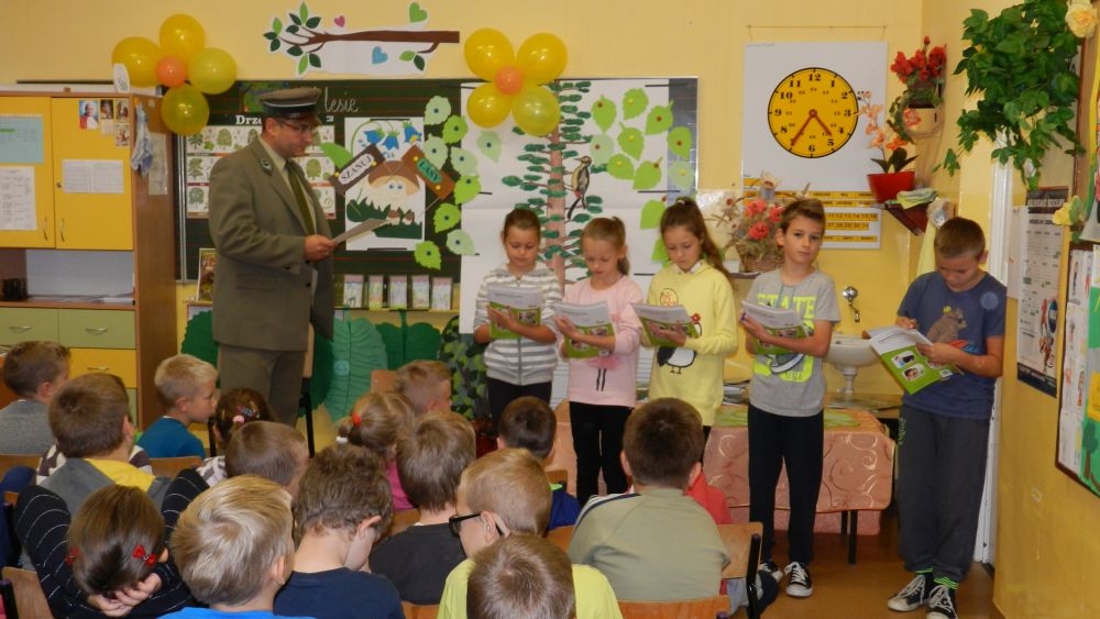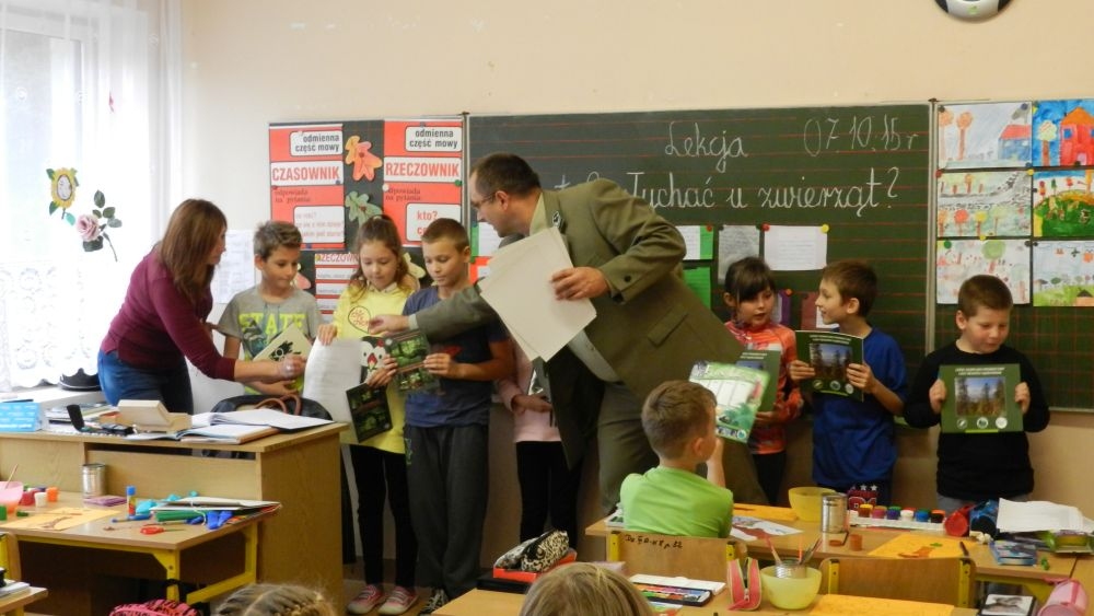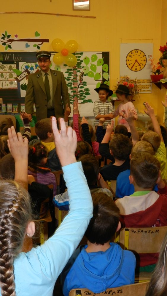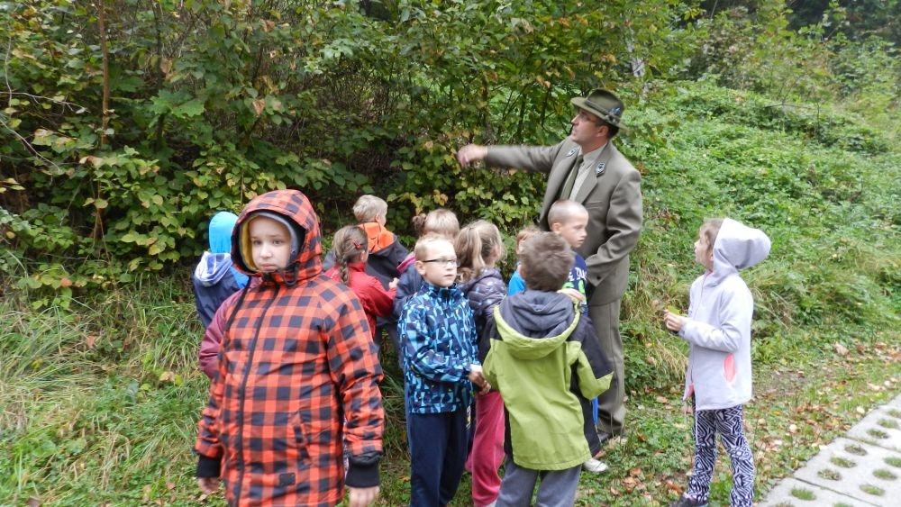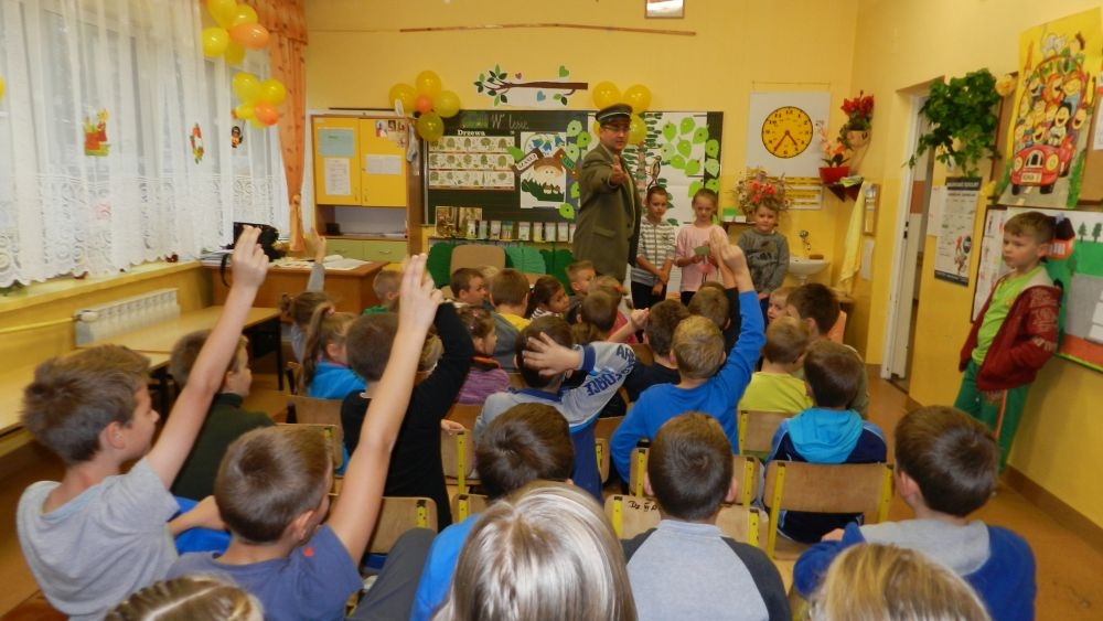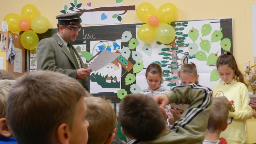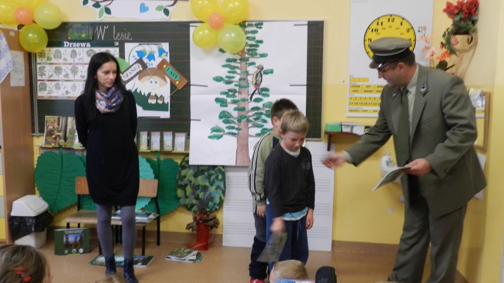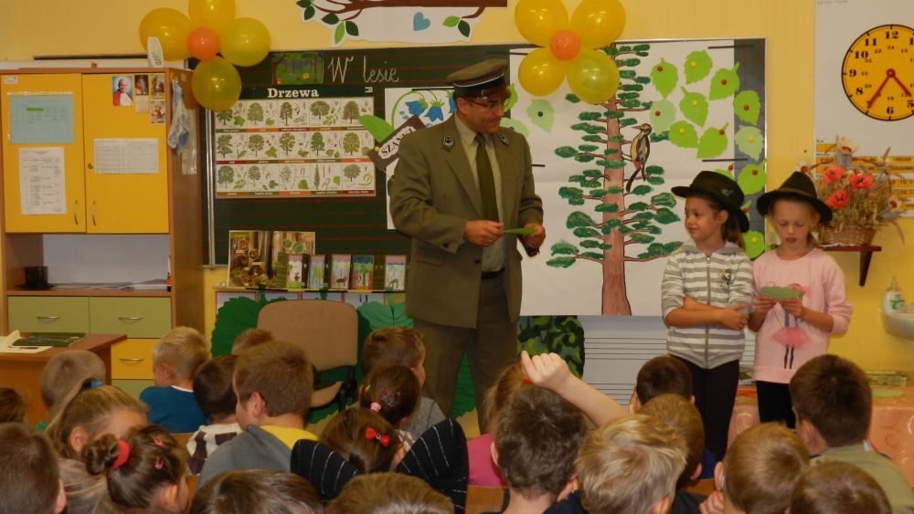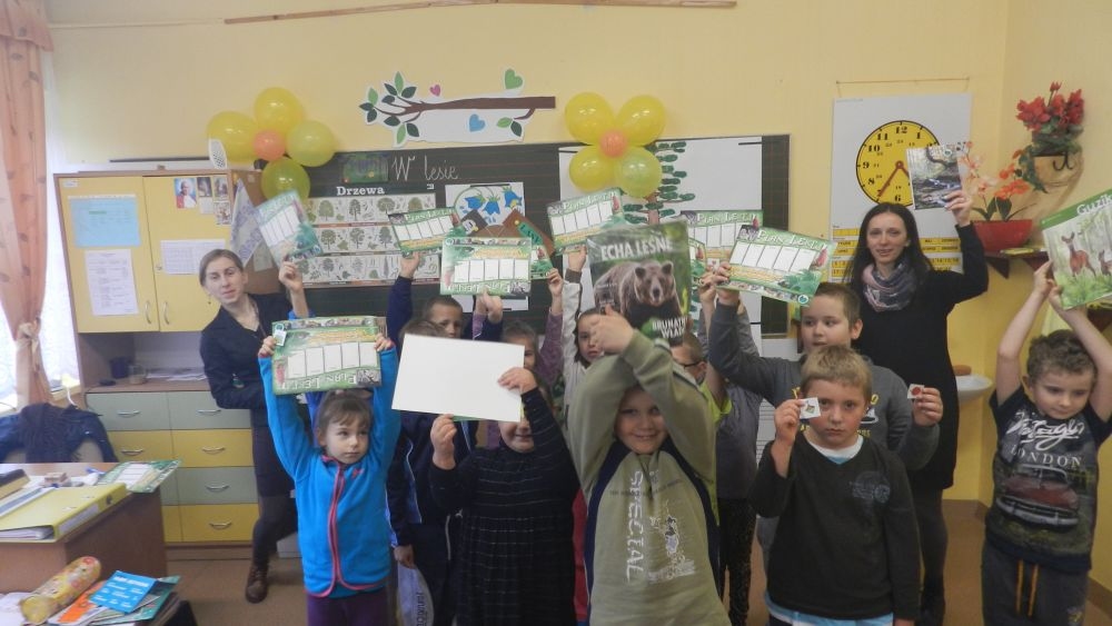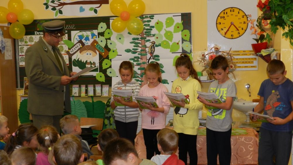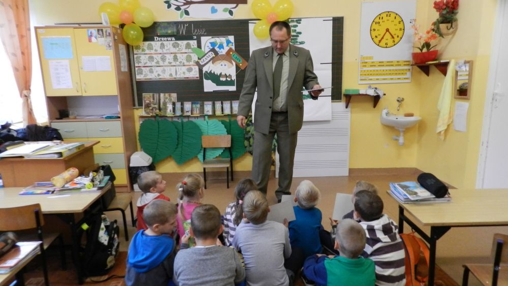 W październikowy poranek do szkoły w Kosarzyskach zawitał leśnik- Roman Rams. Wprowadził On uczniów klas I, II, III w świat tajników nadpopradzkiej przyrody, bliskiej dzieciom ze względu na zamieszkanie, ale jeszcze nie do końca zgłębionej przez małych przyrodników. Pan Roman Rams opowiedział dzieciom o lesie, jego walorach przyrodniczych, korzyściach jakie niesie dla człowieka i innych organizmów żywych. W pogadankę aktywnie angażowali się uczniowie, na żywo zadając pytania lub udzielając odpowiedzi na leśne zagadki. Kiedy dzieci zapoznały się z walorami lasu i umiały wyjaśnić, co znaczy, że „las jest przyjacielem człowieka”, przyszedł czas, by zastanowić się, co my ludzie, możemy uczynić, by odwdzięczyć się przyrodzie, lasowi za okazywane dobra i korzyści, jakie czerpiemy za jego pośrednictwem . Dzieci jednomyślnie stwierdziły, że chcą i będą przyjaciółmi lasu i wiedzą już, jak to zrobić. Po przeprowadzeniu zajęć edukacyjnych, dzieci wzięły udział w konkursach. Dla uczniów klasy I i II leśnik przygotował pytania w formie zagadek, które ukryte były na odwrocie kwiatów i jesiennych liści. Maluchy radziły sobie wyśmienicie z rymowanymi zagadkami. Dla dzieci starszych został przygotowany pisemny quiz, z trudniejszymi pytaniami. By złapać przysłowiowy i dosłowny oddech, uczniowie wyruszyli na zajęcia w terenie. Warsztaty leśne dały możliwość poznania etapów powstawania lasu i poznania trudu, jaki trzeba włożyć w to, by ludzie mogli korzystać i cieszyć się jego wieloaspektowymi walorami. Na spotkaniu w terenie, dzieci wielozmysłowo poznawały las, poprzez dotyk, węch, słuch i wzrokowe podziwianie przyrody. Uczniowie rozróżniali także gatunki drzew po ich korze, liściach i owocach. Poprzez leśne poszukiwania, pogadanki, pytania i odpowiedzi uczniowie zrozumieli sens cyklu powstawania lasu : „od nasionka do nasionka”. Po terenowych wojażach uczniowie powrócili do szkoły, gdzie ogłoszone zostały wyniki przeprowadzonych konkursów przyrodniczych. Ci najlepsi zostali uhonorowani nagrodami książkowymi, kolorowankami, notesami i gadżetami, przekazanymi przez Nadleśnictwo Piwniczna. Również nasz leśny edukator- Roman Rams został nagrodzony przez dzieci gromkimi brawami oraz własnoręcznie przygotowanymi „oknami na las”- które po rozchyleniu okiennic skrywały piękne krajobrazy naszej okolicy.