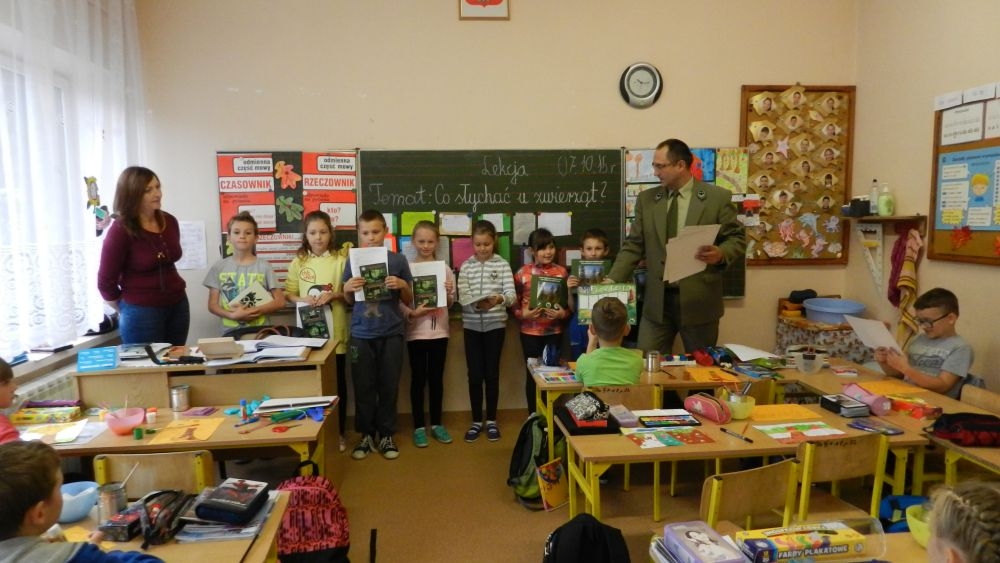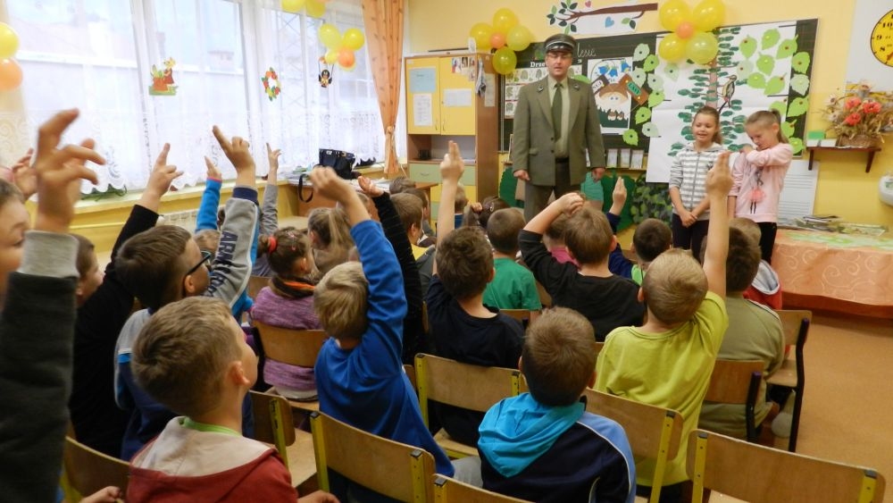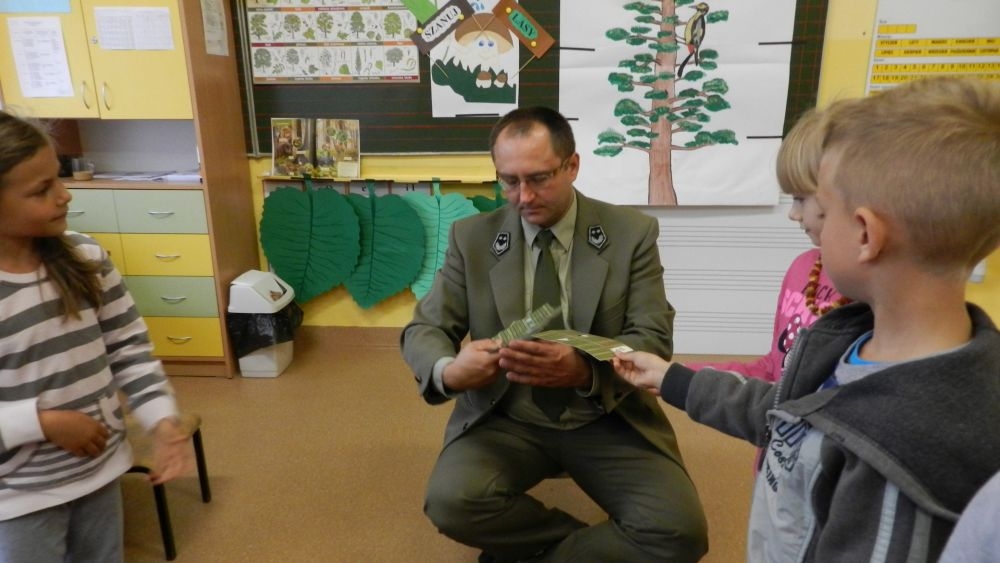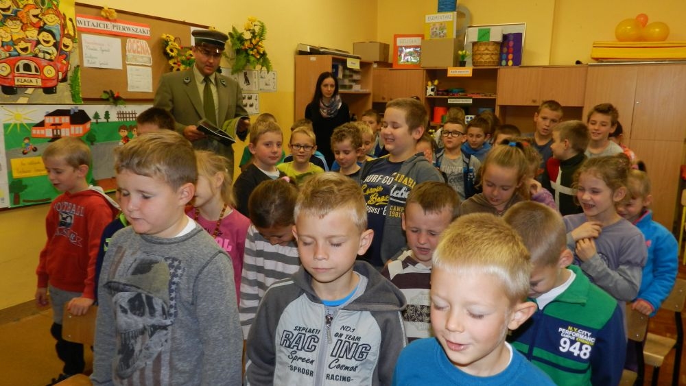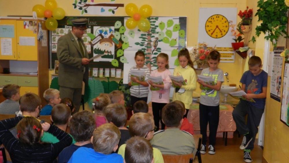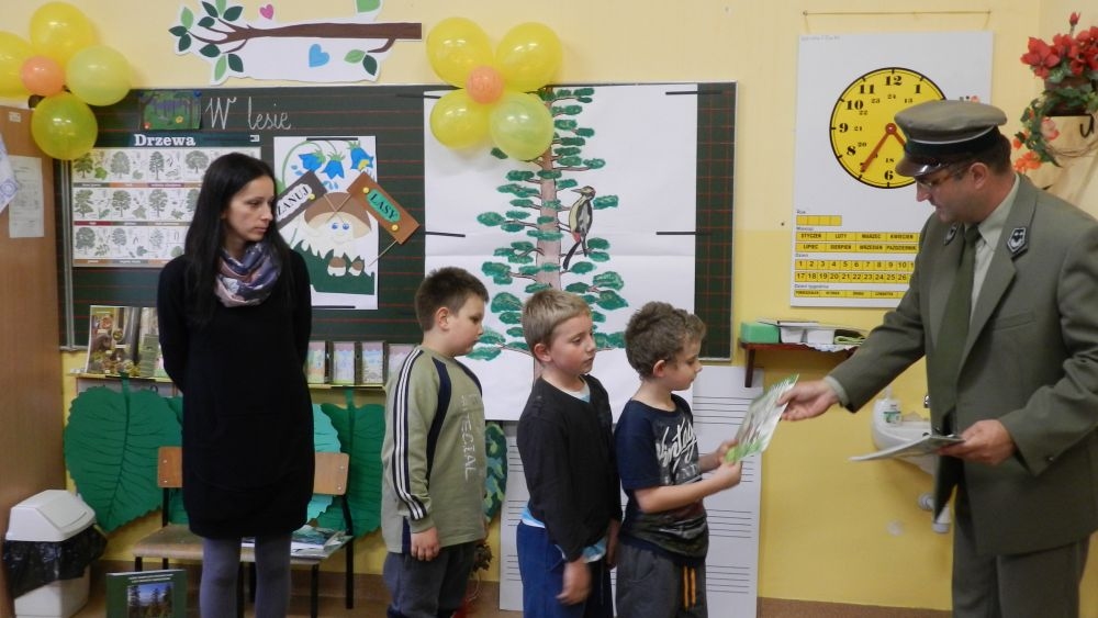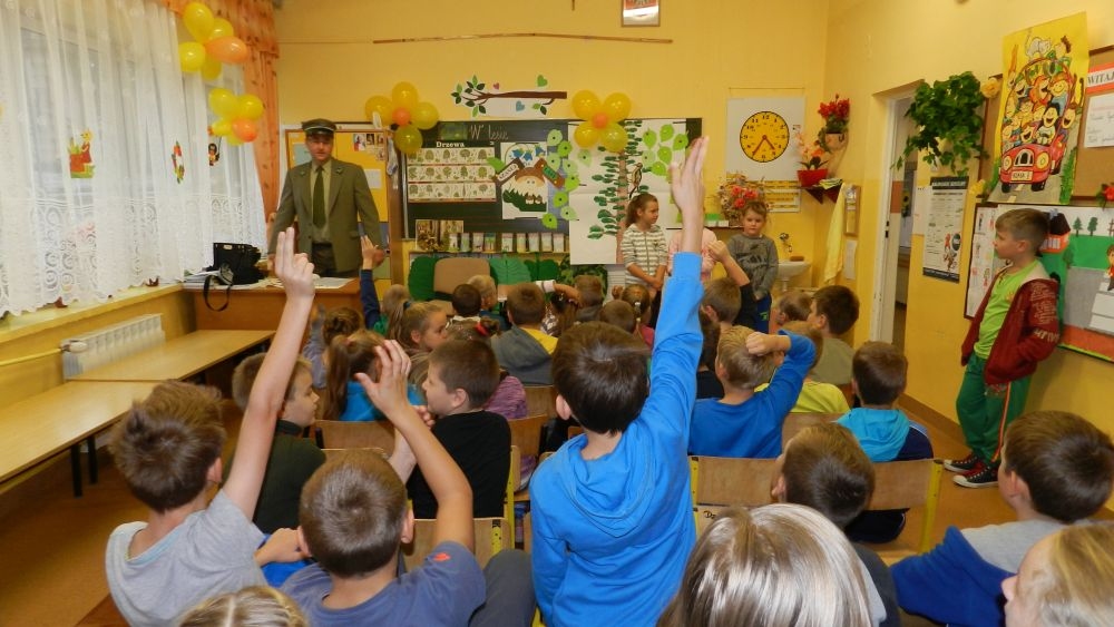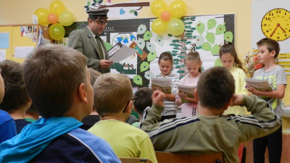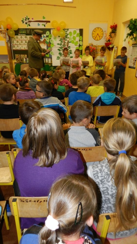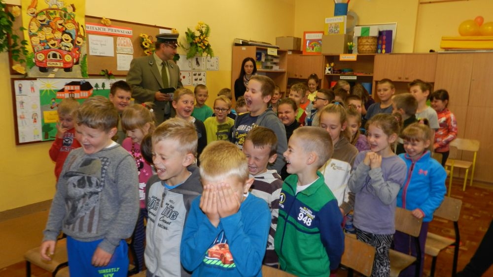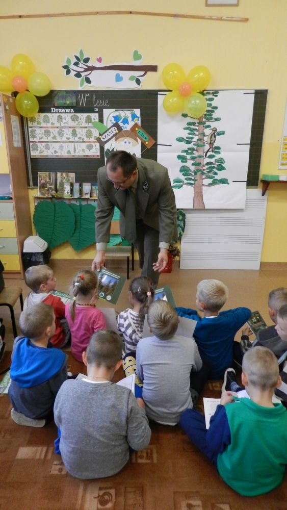 W październikowy poranek do szkoły w Kosarzyskach zawitał leśnik- Roman Rams. Wprowadził On uczniów klas I, II, III w świat tajników nadpopradzkiej przyrody, bliskiej dzieciom ze względu na zamieszkanie, ale jeszcze nie do końca zgłębionej przez małych przyrodników. Pan Roman Rams opowiedział dzieciom o lesie, jego walorach przyrodniczych, korzyściach jakie niesie dla człowieka i innych organizmów żywych. W pogadankę aktywnie angażowali się uczniowie, na żywo zadając pytania lub udzielając odpowiedzi na leśne zagadki. Kiedy dzieci zapoznały się z walorami lasu i umiały wyjaśnić, co znaczy, że „las jest przyjacielem człowieka”, przyszedł czas, by zastanowić się, co my ludzie, możemy uczynić, by odwdzięczyć się przyrodzie, lasowi za okazywane dobra i korzyści, jakie czerpiemy za jego pośrednictwem . Dzieci jednomyślnie stwierdziły, że chcą i będą przyjaciółmi lasu i wiedzą już, jak to zrobić. Po przeprowadzeniu zajęć edukacyjnych, dzieci wzięły udział w konkursach. Dla uczniów klasy I i II leśnik przygotował pytania w formie zagadek, które ukryte były na odwrocie kwiatów i jesiennych liści. Maluchy radziły sobie wyśmienicie z rymowanymi zagadkami. Dla dzieci starszych został przygotowany pisemny quiz, z trudniejszymi pytaniami. By złapać przysłowiowy i dosłowny oddech, uczniowie wyruszyli na zajęcia w terenie. Warsztaty leśne dały możliwość poznania etapów powstawania lasu i poznania trudu, jaki trzeba włożyć w to, by ludzie mogli korzystać i cieszyć się jego wieloaspektowymi walorami. Na spotkaniu w terenie, dzieci wielozmysłowo poznawały las, poprzez dotyk, węch, słuch i wzrokowe podziwianie przyrody. Uczniowie rozróżniali także gatunki drzew po ich korze, liściach i owocach. Poprzez leśne poszukiwania, pogadanki, pytania i odpowiedzi uczniowie zrozumieli sens cyklu powstawania lasu : „od nasionka do nasionka”. Po terenowych wojażach uczniowie powrócili do szkoły, gdzie ogłoszone zostały wyniki przeprowadzonych konkursów przyrodniczych. Ci najlepsi zostali uhonorowani nagrodami książkowymi, kolorowankami, notesami i gadżetami, przekazanymi przez Nadleśnictwo Piwniczna. Również nasz leśny edukator- Roman Rams został nagrodzony przez dzieci gromkimi brawami oraz własnoręcznie przygotowanymi „oknami na las”- które po rozchyleniu okiennic skrywały piękne krajobrazy naszej okolicy.