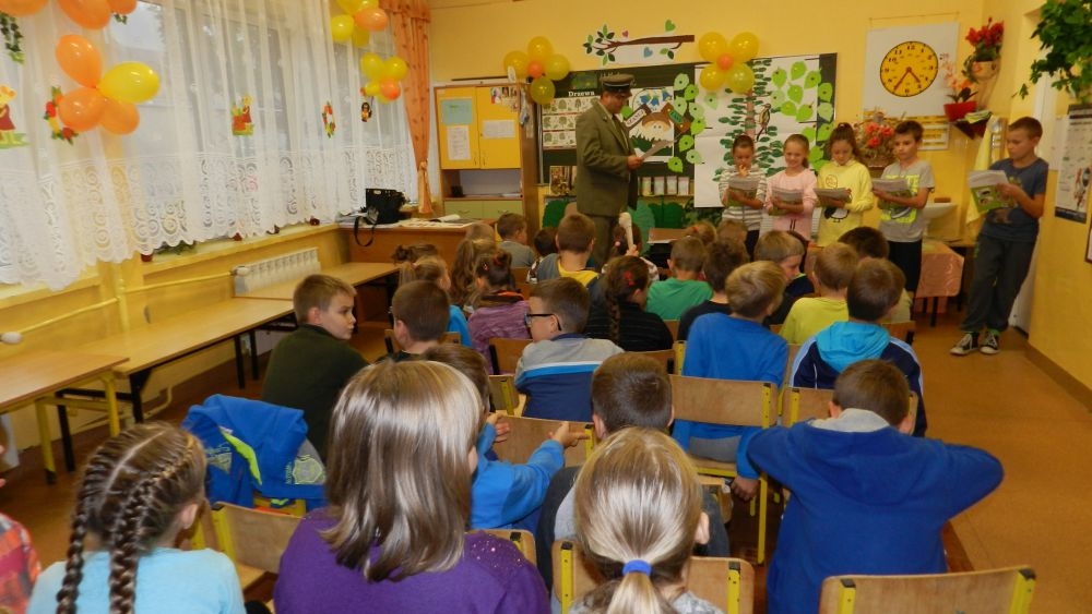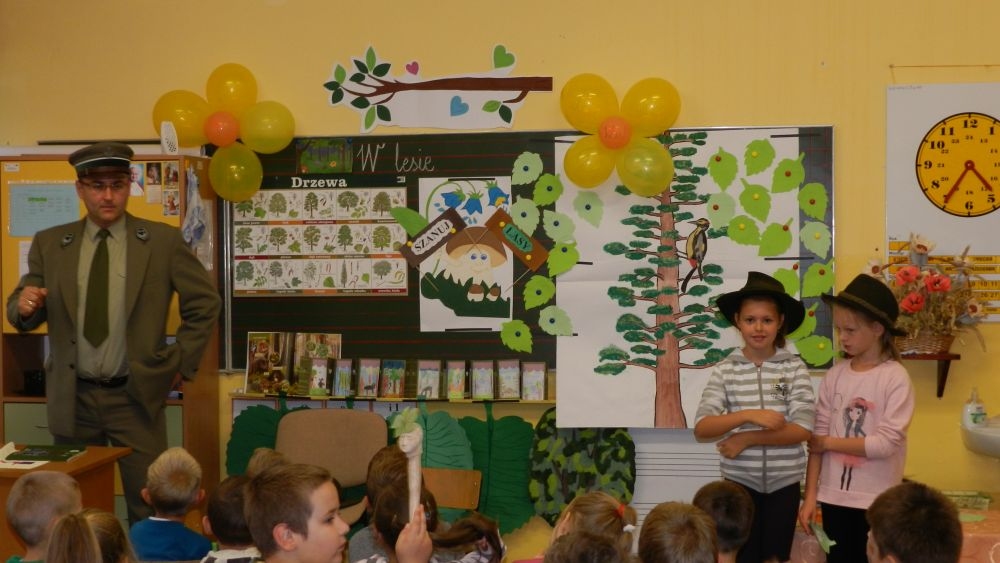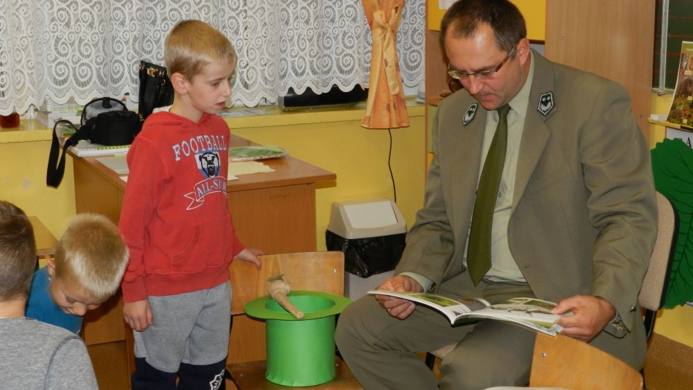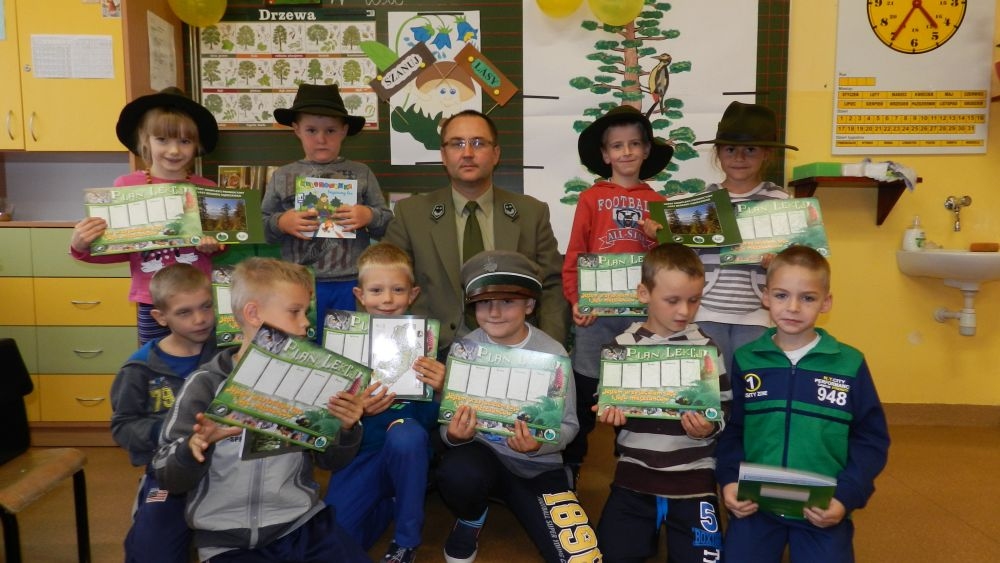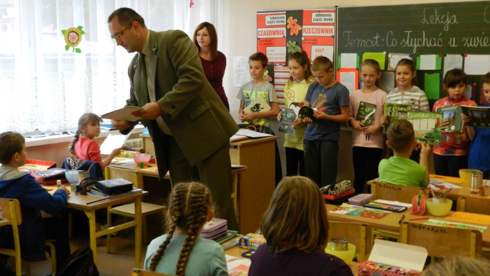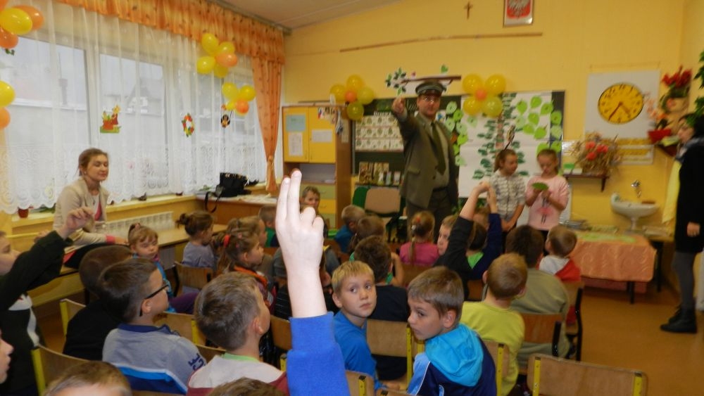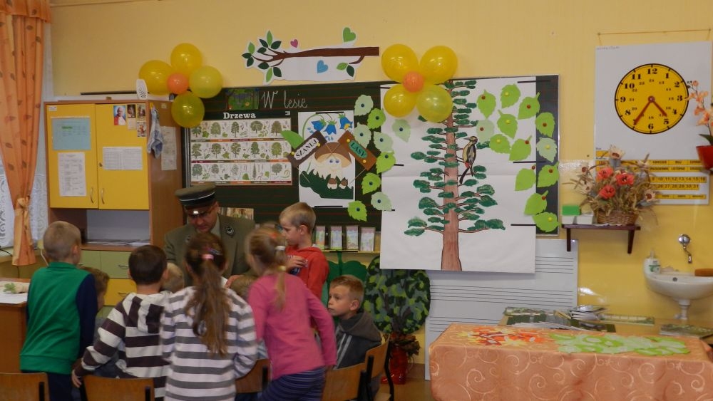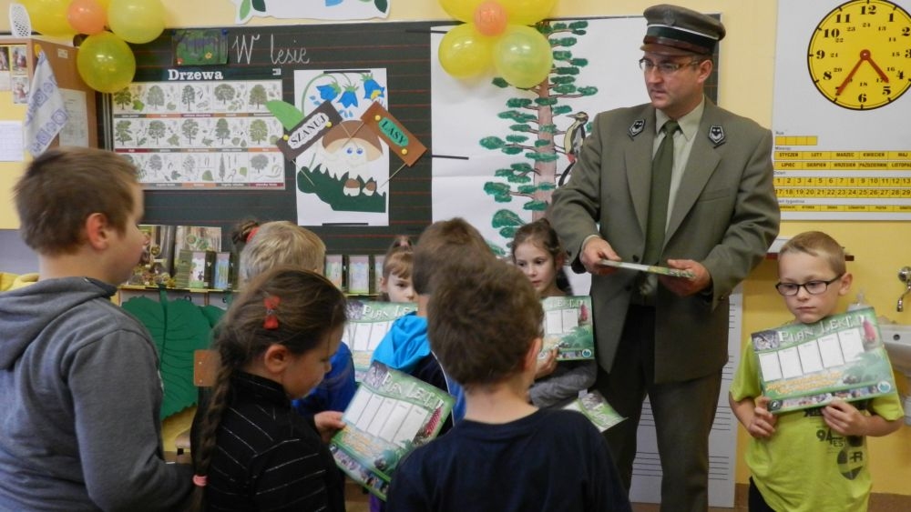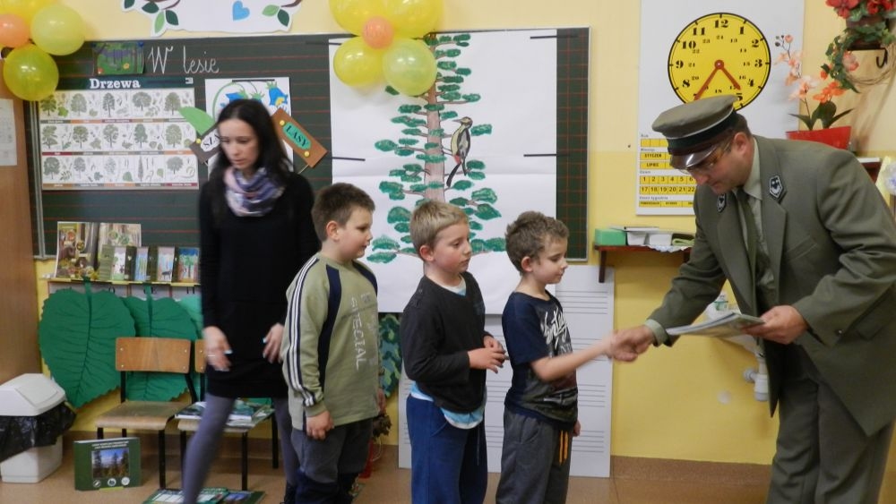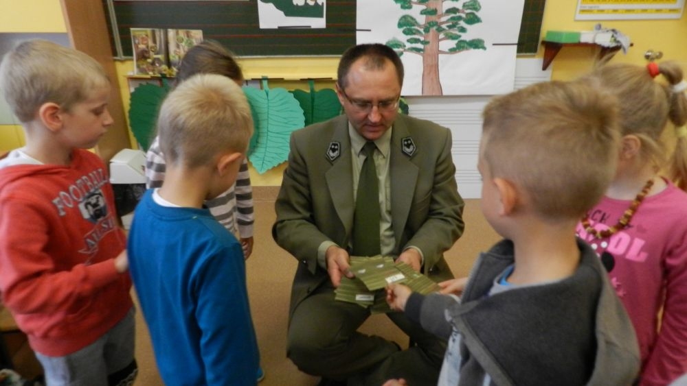 W październikowy poranek do szkoły w Kosarzyskach zawitał leśnik- Roman Rams. Wprowadził On uczniów klas I, II, III w świat tajników nadpopradzkiej przyrody, bliskiej dzieciom ze względu na zamieszkanie, ale jeszcze nie do końca zgłębionej przez małych przyrodników. Pan Roman Rams opowiedział dzieciom o lesie, jego walorach przyrodniczych, korzyściach jakie niesie dla człowieka i innych organizmów żywych. W pogadankę aktywnie angażowali się uczniowie, na żywo zadając pytania lub udzielając odpowiedzi na leśne zagadki. Kiedy dzieci zapoznały się z walorami lasu i umiały wyjaśnić, co znaczy, że „las jest przyjacielem człowieka”, przyszedł czas, by zastanowić się, co my ludzie, możemy uczynić, by odwdzięczyć się przyrodzie, lasowi za okazywane dobra i korzyści, jakie czerpiemy za jego pośrednictwem . Dzieci jednomyślnie stwierdziły, że chcą i będą przyjaciółmi lasu i wiedzą już, jak to zrobić. Po przeprowadzeniu zajęć edukacyjnych, dzieci wzięły udział w konkursach. Dla uczniów klasy I i II leśnik przygotował pytania w formie zagadek, które ukryte były na odwrocie kwiatów i jesiennych liści. Maluchy radziły sobie wyśmienicie z rymowanymi zagadkami. Dla dzieci starszych został przygotowany pisemny quiz, z trudniejszymi pytaniami. By złapać przysłowiowy i dosłowny oddech, uczniowie wyruszyli na zajęcia w terenie. Warsztaty leśne dały możliwość poznania etapów powstawania lasu i poznania trudu, jaki trzeba włożyć w to, by ludzie mogli korzystać i cieszyć się jego wieloaspektowymi walorami. Na spotkaniu w terenie, dzieci wielozmysłowo poznawały las, poprzez dotyk, węch, słuch i wzrokowe podziwianie przyrody. Uczniowie rozróżniali także gatunki drzew po ich korze, liściach i owocach. Poprzez leśne poszukiwania, pogadanki, pytania i odpowiedzi uczniowie zrozumieli sens cyklu powstawania lasu : „od nasionka do nasionka”. Po terenowych wojażach uczniowie powrócili do szkoły, gdzie ogłoszone zostały wyniki przeprowadzonych konkursów przyrodniczych. Ci najlepsi zostali uhonorowani nagrodami książkowymi, kolorowankami, notesami i gadżetami, przekazanymi przez Nadleśnictwo Piwniczna. Również nasz leśny edukator- Roman Rams został nagrodzony przez dzieci gromkimi brawami oraz własnoręcznie przygotowanymi „oknami na las”- które po rozchyleniu okiennic skrywały piękne krajobrazy naszej okolicy.
