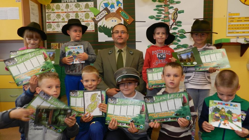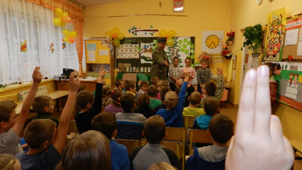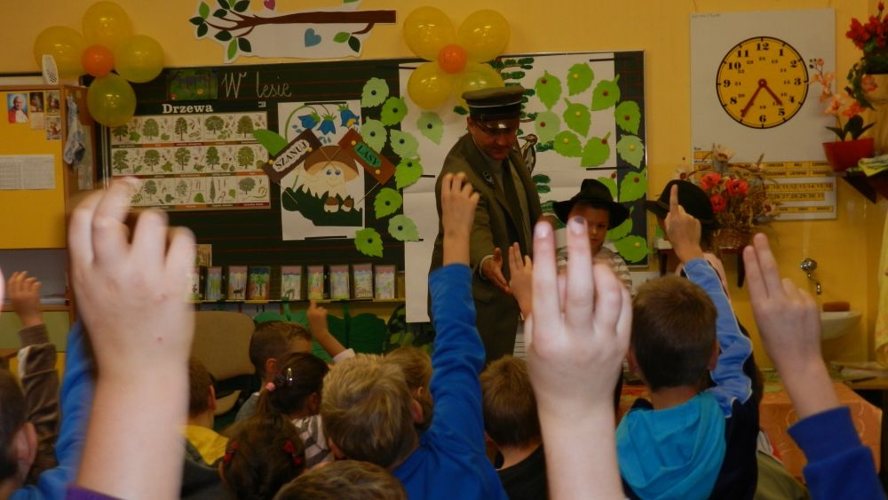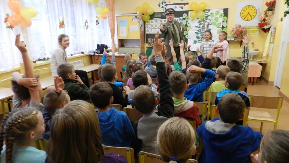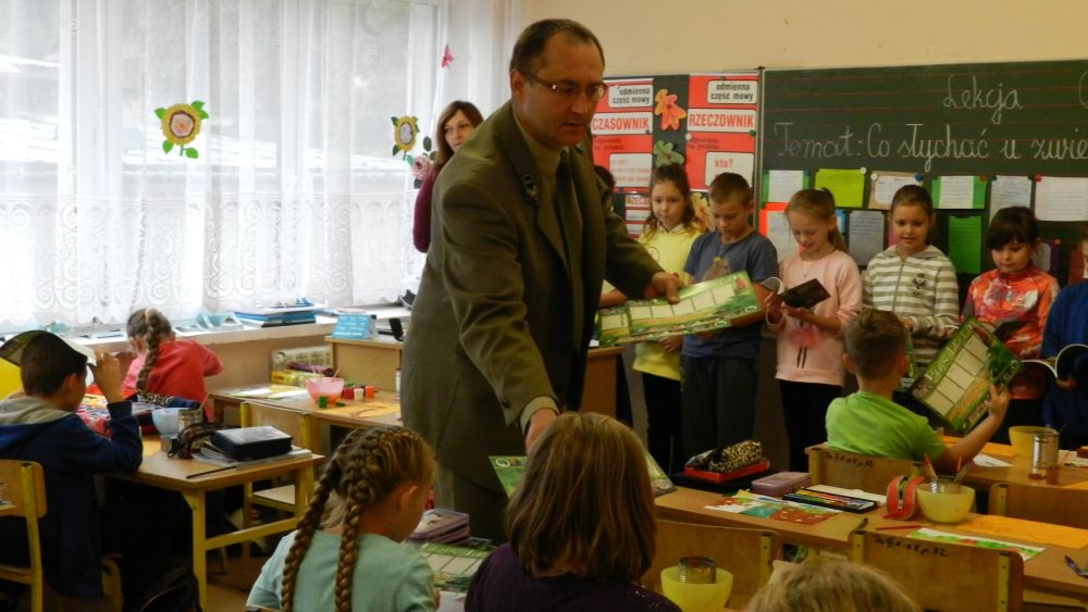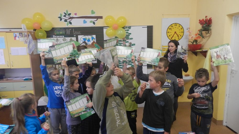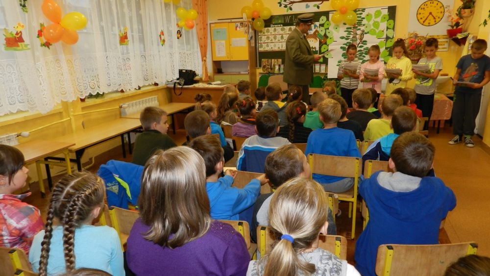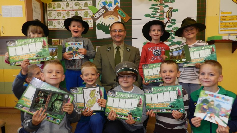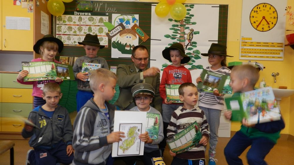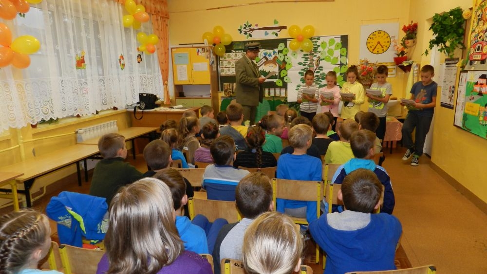 W październikowy poranek do szkoły w Kosarzyskach zawitał leśnik- Roman Rams. Wprowadził On uczniów klas I, II, III w świat tajników nadpopradzkiej przyrody, bliskiej dzieciom ze względu na zamieszkanie, ale jeszcze nie do końca zgłębionej przez małych przyrodników. Pan Roman Rams opowiedział dzieciom o lesie, jego walorach przyrodniczych, korzyściach jakie niesie dla człowieka i innych organizmów żywych. W pogadankę aktywnie angażowali się uczniowie, na żywo zadając pytania lub udzielając odpowiedzi na leśne zagadki. Kiedy dzieci zapoznały się z walorami lasu i umiały wyjaśnić, co znaczy, że „las jest przyjacielem człowieka”, przyszedł czas, by zastanowić się, co my ludzie, możemy uczynić, by odwdzięczyć się przyrodzie, lasowi za okazywane dobra i korzyści, jakie czerpiemy za jego pośrednictwem . Dzieci jednomyślnie stwierdziły, że chcą i będą przyjaciółmi lasu i wiedzą już, jak to zrobić. Po przeprowadzeniu zajęć edukacyjnych, dzieci wzięły udział w konkursach. Dla uczniów klasy I i II leśnik przygotował pytania w formie zagadek, które ukryte były na odwrocie kwiatów i jesiennych liści. Maluchy radziły sobie wyśmienicie z rymowanymi zagadkami. Dla dzieci starszych został przygotowany pisemny quiz, z trudniejszymi pytaniami. By złapać przysłowiowy i dosłowny oddech, uczniowie wyruszyli na zajęcia w terenie. Warsztaty leśne dały możliwość poznania etapów powstawania lasu i poznania trudu, jaki trzeba włożyć w to, by ludzie mogli korzystać i cieszyć się jego wieloaspektowymi walorami. Na spotkaniu w terenie, dzieci wielozmysłowo poznawały las, poprzez dotyk, węch, słuch i wzrokowe podziwianie przyrody. Uczniowie rozróżniali także gatunki drzew po ich korze, liściach i owocach. Poprzez leśne poszukiwania, pogadanki, pytania i odpowiedzi uczniowie zrozumieli sens cyklu powstawania lasu : „od nasionka do nasionka”. Po terenowych wojażach uczniowie powrócili do szkoły, gdzie ogłoszone zostały wyniki przeprowadzonych konkursów przyrodniczych. Ci najlepsi zostali uhonorowani nagrodami książkowymi, kolorowankami, notesami i gadżetami, przekazanymi przez Nadleśnictwo Piwniczna. Również nasz leśny edukator- Roman Rams został nagrodzony przez dzieci gromkimi brawami oraz własnoręcznie przygotowanymi „oknami na las”- które po rozchyleniu okiennic skrywały piękne krajobrazy naszej okolicy.
