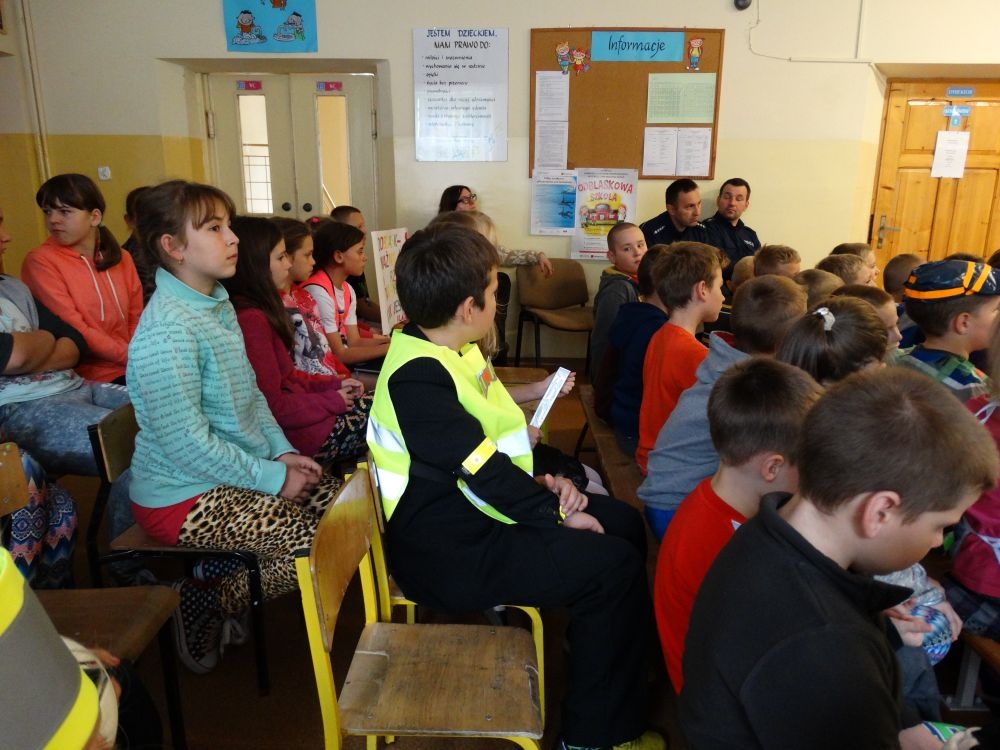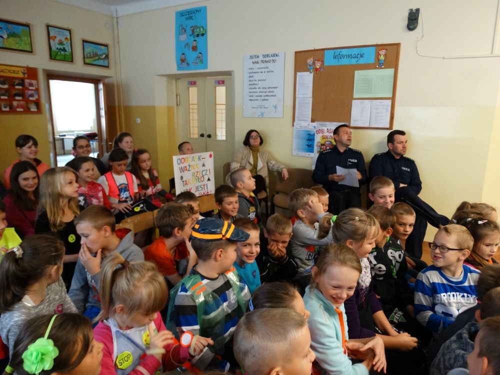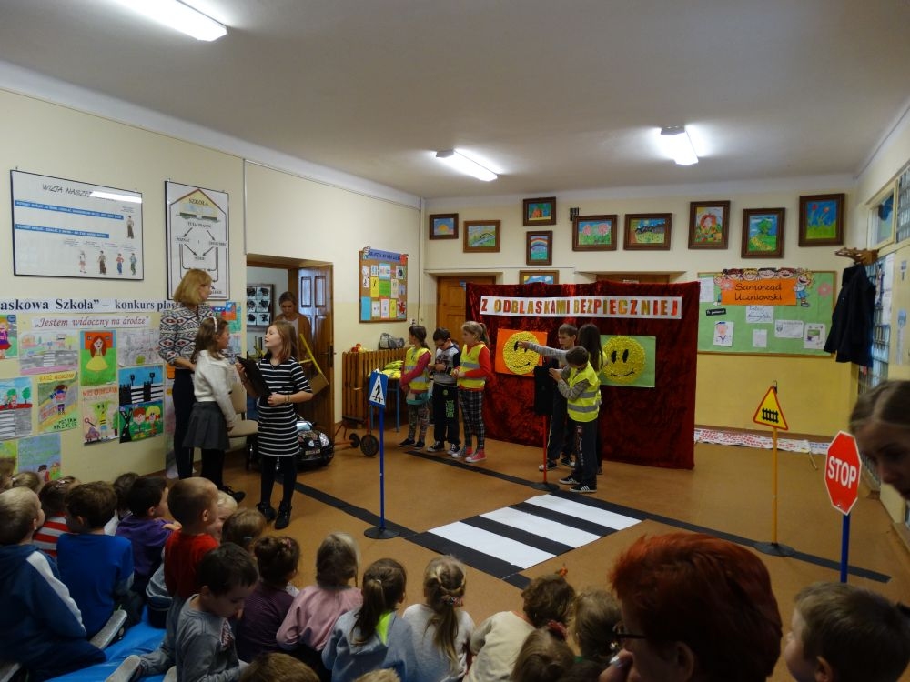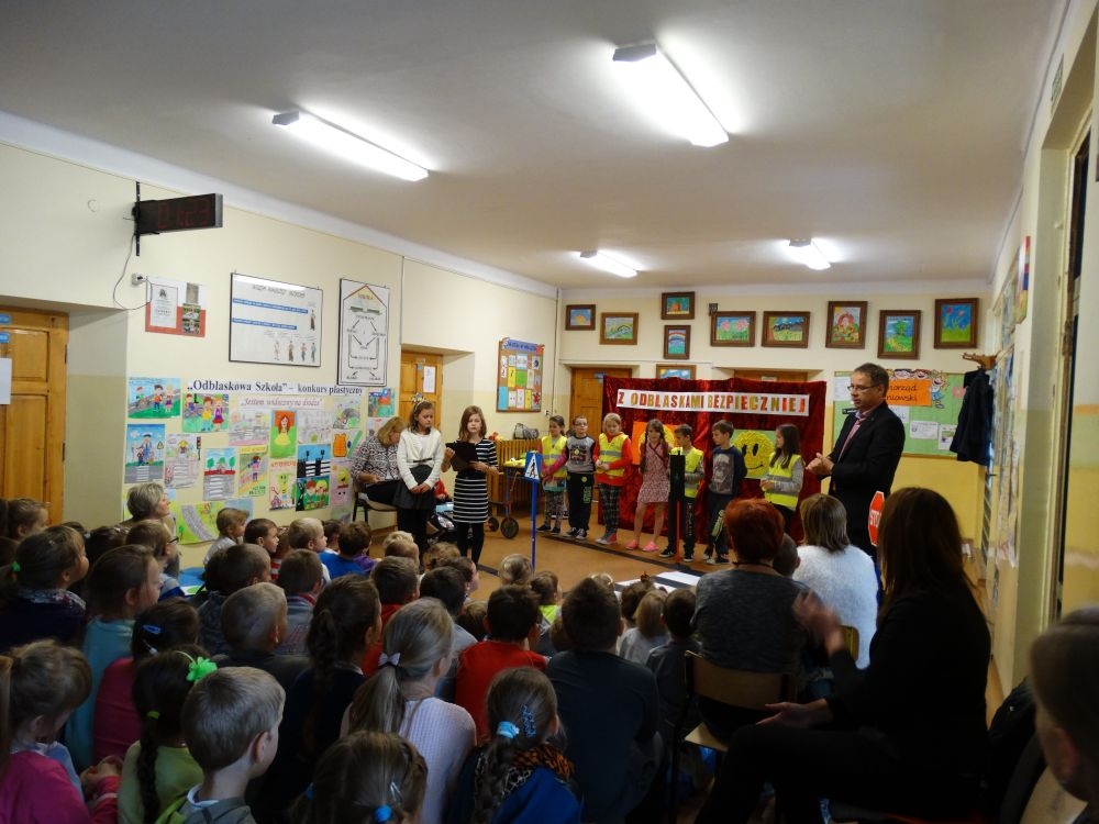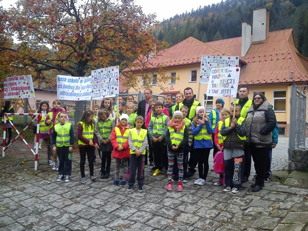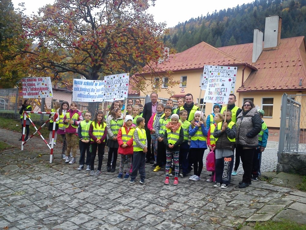Po raz drugi nasza szkoła przystąpiła do akcji „Odblaskowa Szkoła”, organizowanej przez Wydział Ruchu Drogowego Komendy Wojewódzkiej Policji w Krakowie. Konkurs ma na celu propagowanie zachowań, prowadzących do poprawy bezpieczeństwa na naszych drogach. Dzieci w formie zabaw oraz konkursów zdobywały i utrwalały wiedzę o bezpiecznych zachowaniach w drodze do i ze szkoły. W ramach realizacji tego przedsięwzięcia 16 października odbyło się spotkanie uczniów z policjantami z Komisariatu Policji w Piwnicznej Zdroju - aspirantem sztabowym Wiesławem Kozieńskim i młodszym aspirantem Marcinem Bołozem. Goście opowiadali o obowiązujących przepisach ruchu drogowego i o konieczności przestrzegania ich. Przypomnieli podstawowe zasady bezpiecznego poruszania się po drogach. Szczególną uwagę zwrócili na to, iż noszenie elementów odblaskowych na ubraniach i plecakach może niejednokrotnie uchronić od nieszczęścia. Dzieci zadawały mnóstwo pytań, na które policjanci cierpliwie i chętnie odpowiadali. Uczniowie podczas spotkania przedstawili inscenizację „ Z odblaskami bezpieczniej” promującą odblaski i bezpieczeństwo dzieci, które poruszają się codziennie po drodze. Wielką atrakcją był pokaz mody odblaskowej. Uczniowie prezentowali stroje wykonane z wykorzystaniem elementów odblaskowych. Na spotkaniu zostały wręczone dyplomy oraz nagrody zdobyte w Ogólnoszkolnym Konkursie Plastycznym. Dzieci wykazały się dużą pomysłowością, jak również wrażliwością artystyczną. Prace oceniało specjalne jury. Po nadzwyczaj burzliwej naradzie przyznano następujące miejsca i wyróżnienia: I miejsce – Anna Malczak kl. VI II miejsce – Monika Wnęk kl.V III miejsce – Karolina Wnęk kl.VI Wyróżnienie: Zuzanna Cużytek kl.VI Wszystkim młodym artystom dziękujemy za udział, a zwycięzcom gratulujemy! Jednym z ważniejszych elementów akcji było wyposażenie uczniów w kamizelki i elementy odblaskowe, gdyż zgodnie z ustawą każdy pieszy, poruszający się po zmierzchu po drodze poza obszarem zabudowanym, ma obowiązek używania elementów odblaskowych.