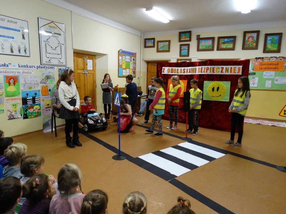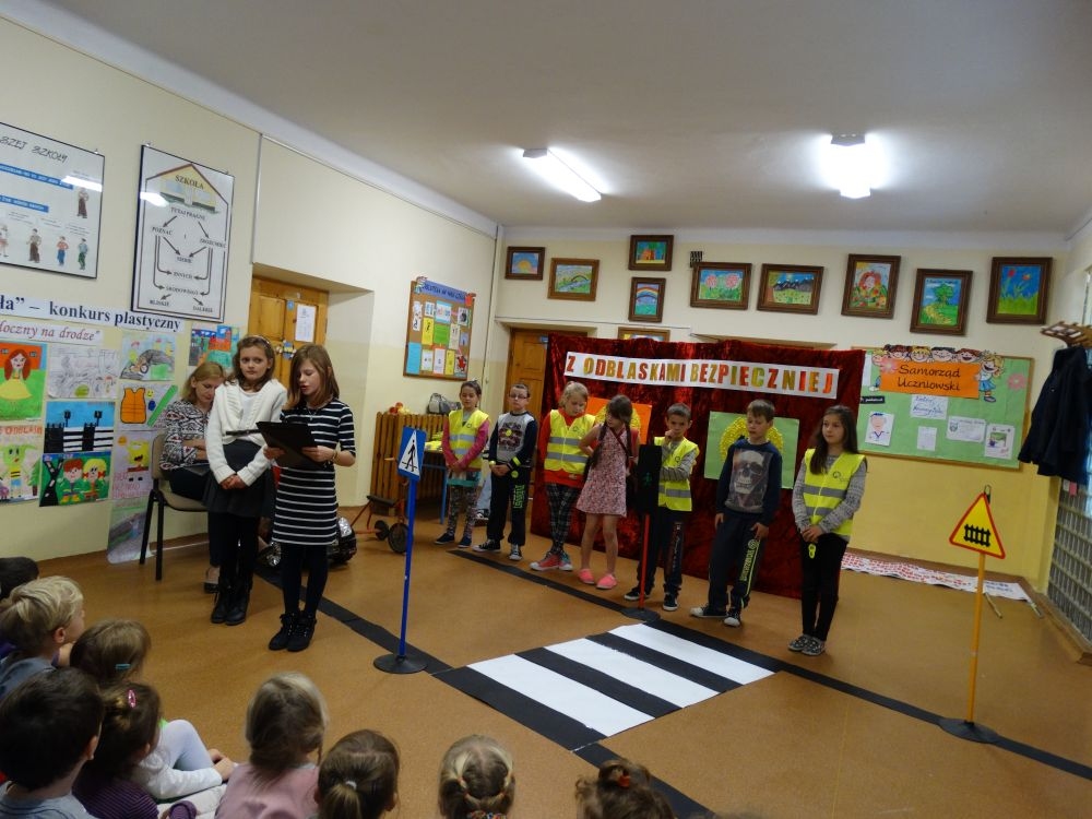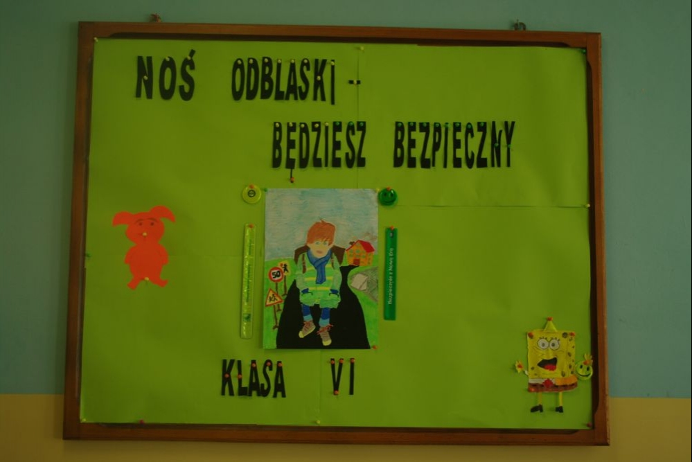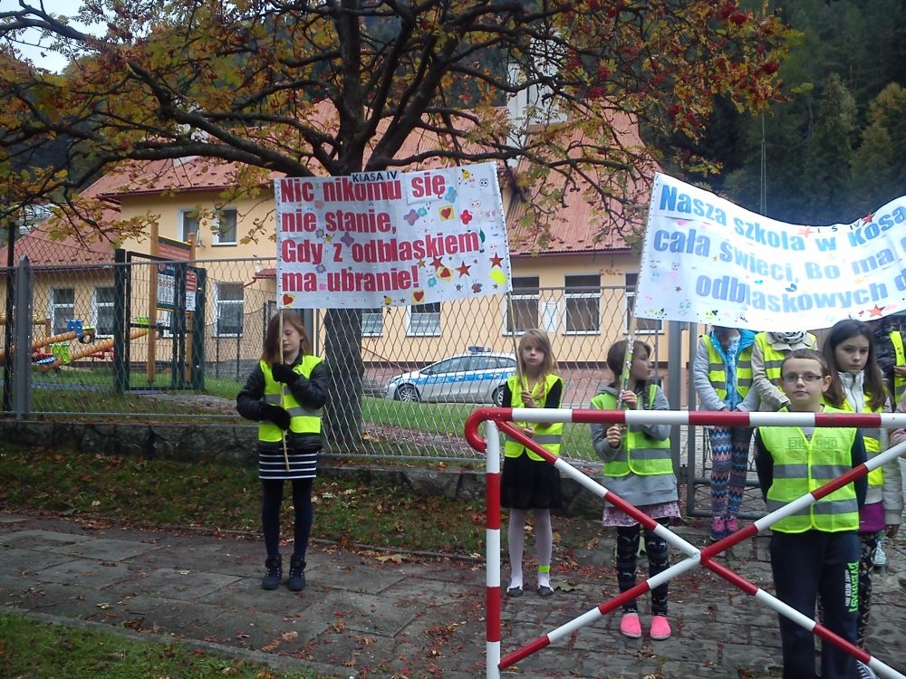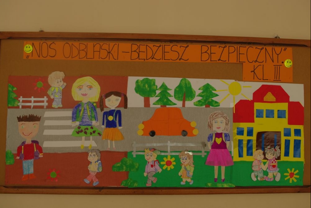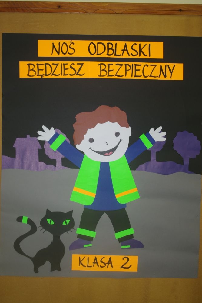 Wszyscy uczniowie zostali obdarowani odblaskami oraz dzięki firmie Tauron i rodzicom uczniowie klas IV – VI dodatkowo otrzymali kamizelki. Każdy uczeń klasy IV na zajęciach technicznych samodzielnie wykonał postać Pana Stopa. Tematyka zajęć doskonale wpisała się w program akcji „Odblaskowa Szkoła”, gdyż Pan Stop ma przypominać wszystkim o zasadach prawidłowego zachowania na jezdni. W tym celu do jego tułowia dzieci przymocowały zrobione przez siebie, najważniejsze znaki drogowe. Promocji i popularyzacji głównych założeń akcji mają służyć, również wykonane przez uczniów gazetki ścienne. W poszczególnych salach lekcyjnych można podziwiać prace, których motywem przewodnim są elementy odblaskowe. Uczniowie starszych klas na lekcjach wychowawczych wykonywali transparenty z hasłami propagującymi noszenie odblasków. Mamy nadzieję, że wszystkie działania, które zostały przeprowadzone przyczynią się do zwiększenia bezpieczeństwa w drodze do i ze szkoły naszych uczniów, ale także uświadomią innym, że noszenie odblasków powinno stać się nawykiem.