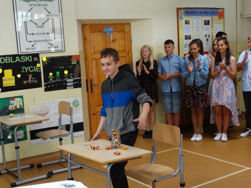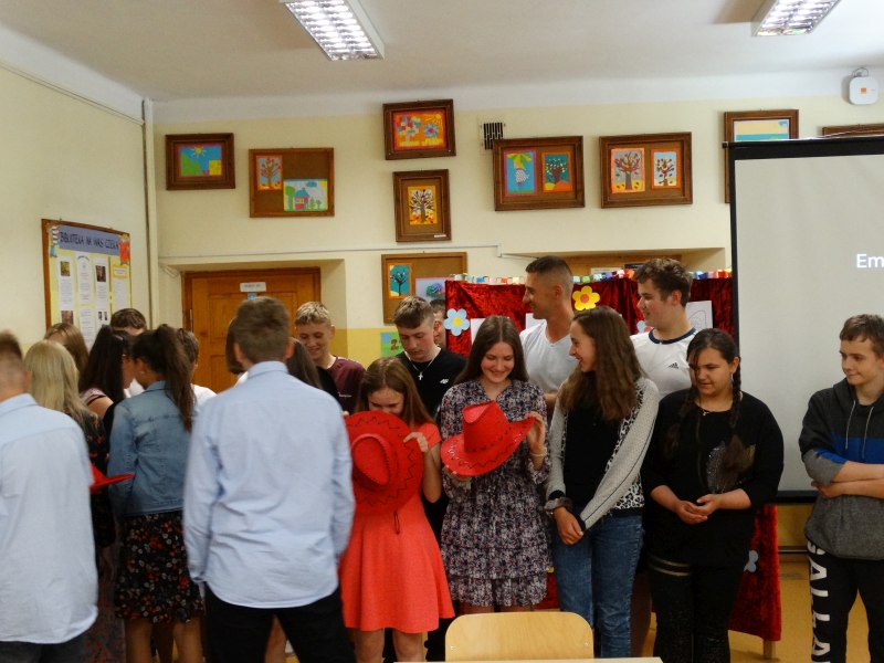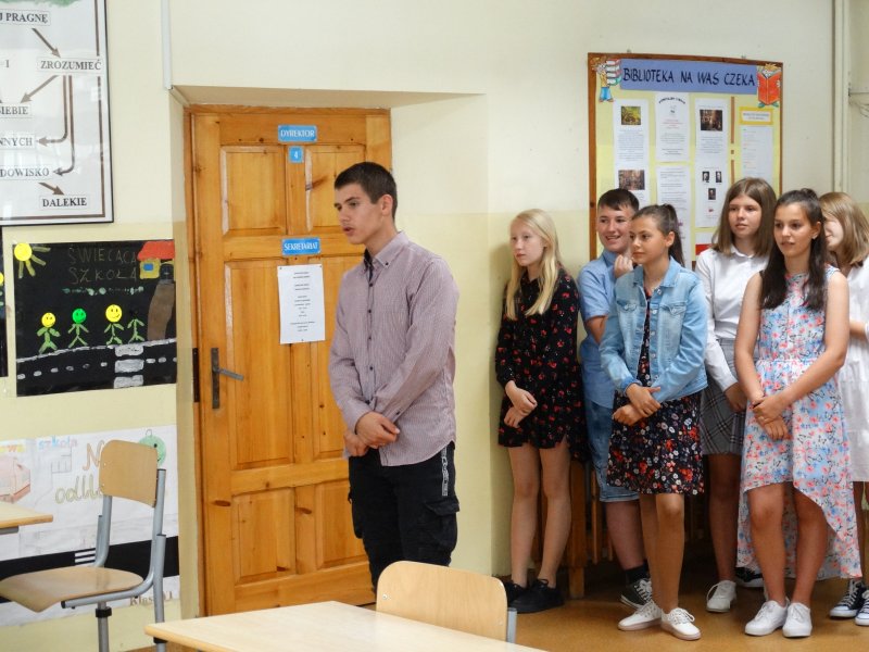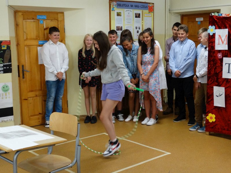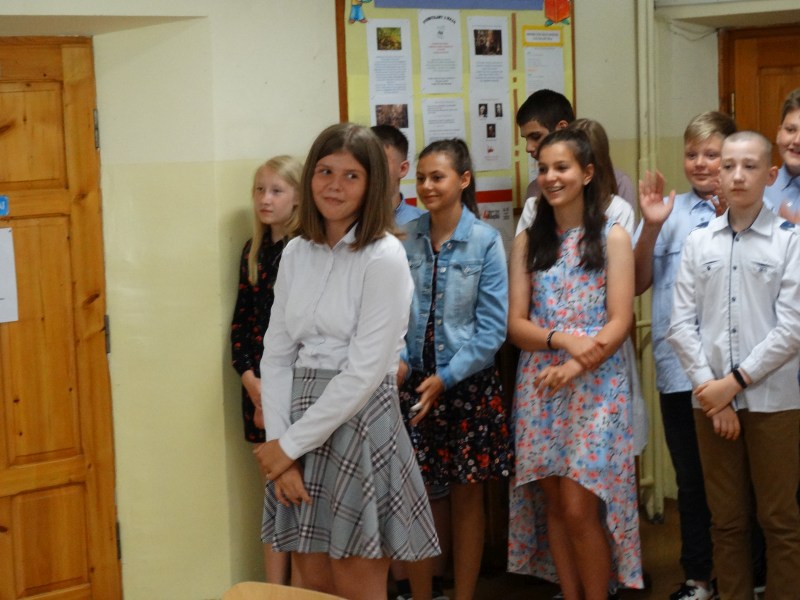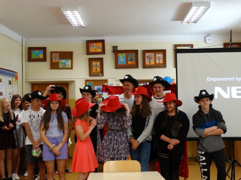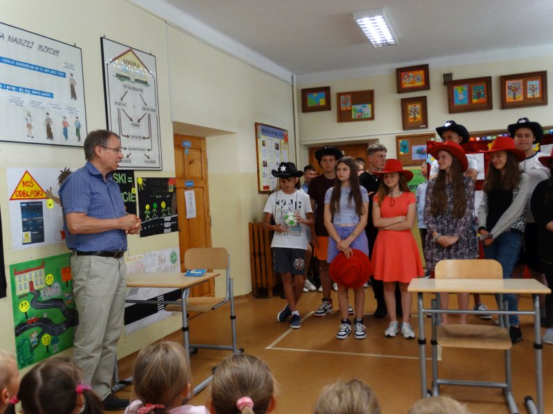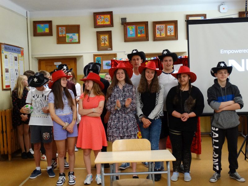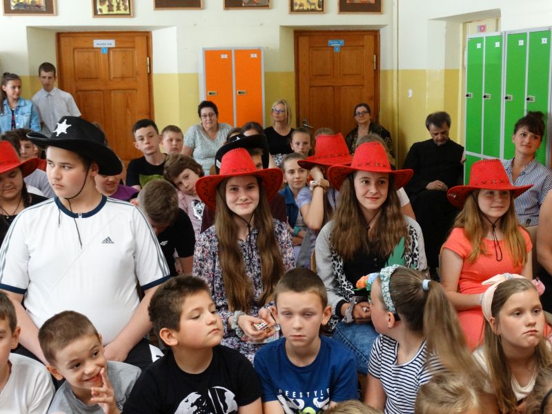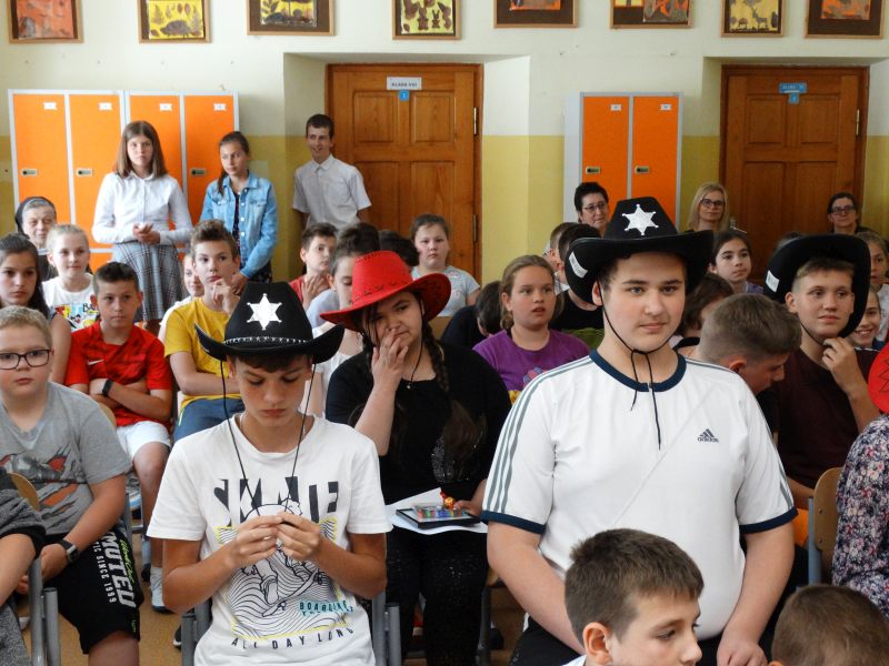 W tym dniu wychowawczyni klasy p.Agata Świeboda wraz z swoją klasą VII pożegnała naszych absolwentów klasy VIII. Jest u nas taka tradycja, że dzień wcześniej absolwenci szkoły są żegnani przez społeczność szkolną na wesoło i humorystycznie. Każdy z nich powiedział coś o sobie i były zadania dla nich do wykonania. Jednym słowem zostali przetestowani z swoich umiejętności i wiadomości. Było trochę emocji i radości ale sobie poradzili z tym dobrze. Na zakończenie spotkania wychowawca klasy 8 p.Filip Malik przedstawił prezentację historyczną o swojej klasie pokazując zdjęcia sprzed wielu lat i było możliwość wspomnień i wzruszeń szczególnie dla absolwentów. Otrzymali też od klasy 7 upominki w postaci kapeluszy ,,kowbojskich”.