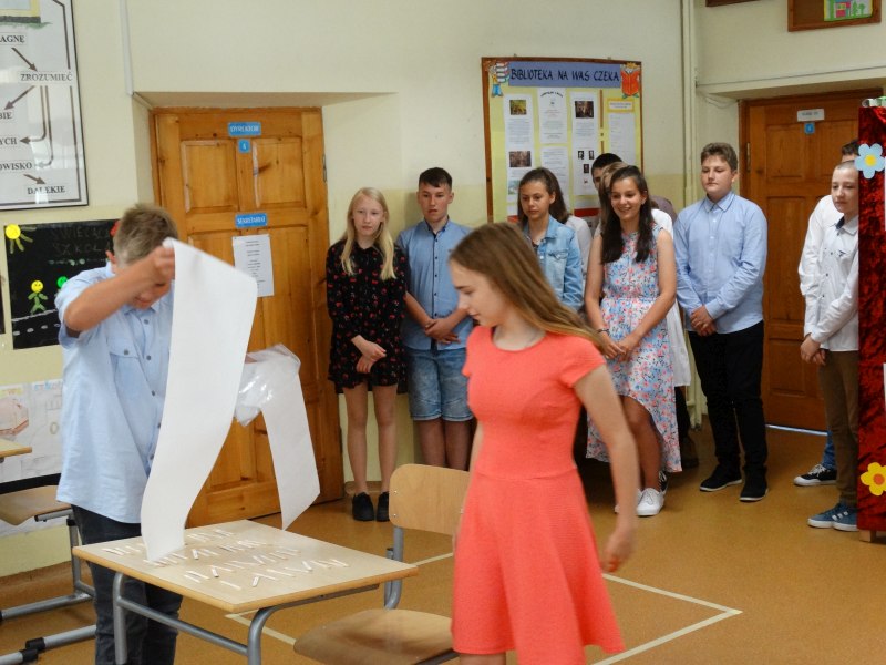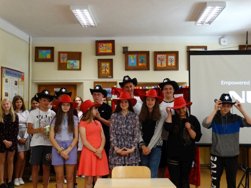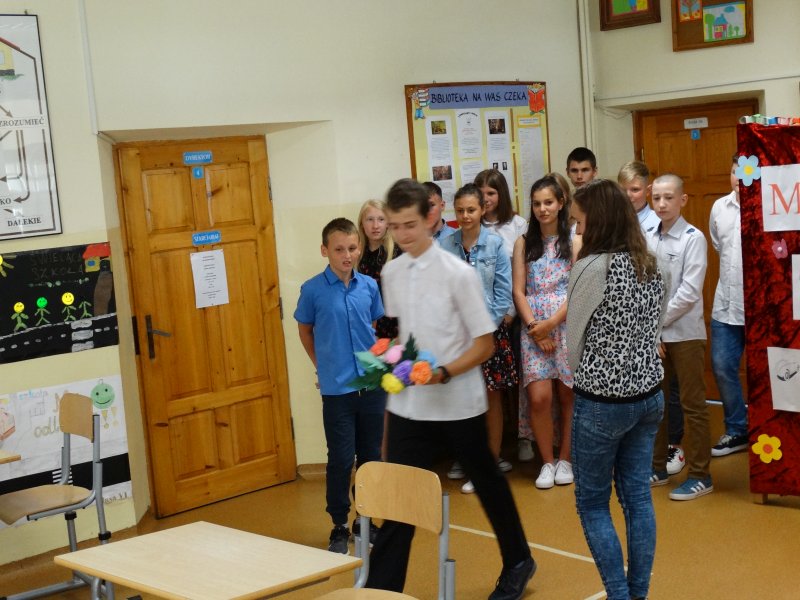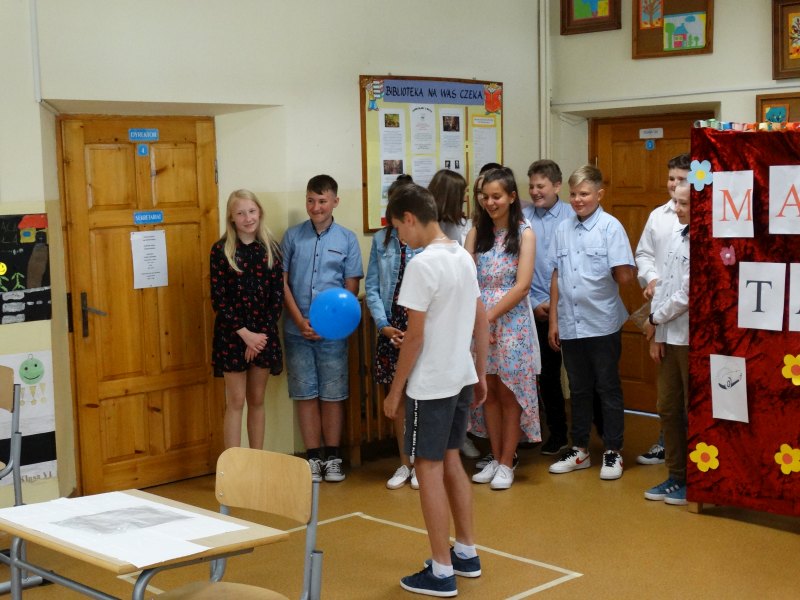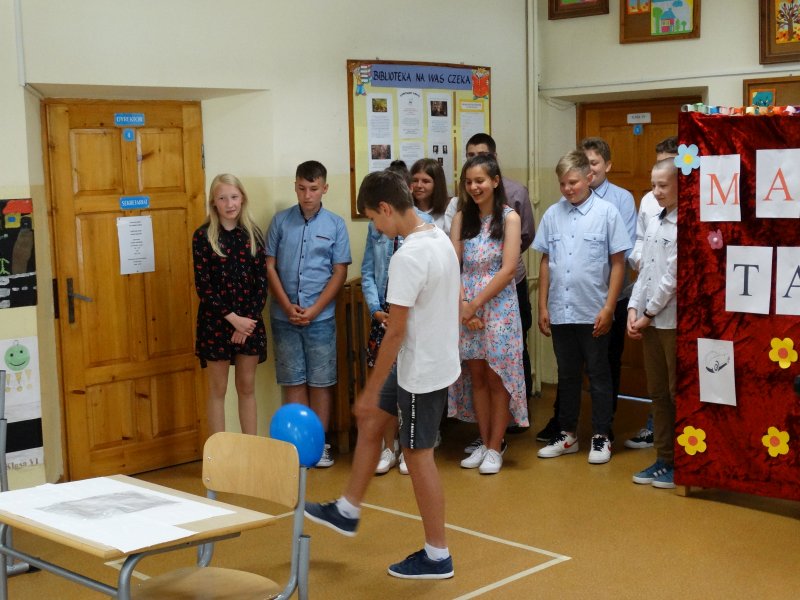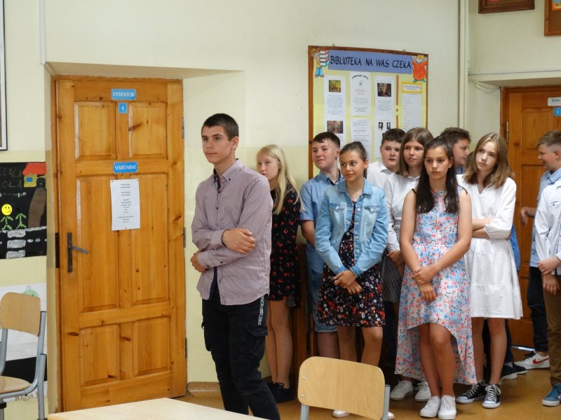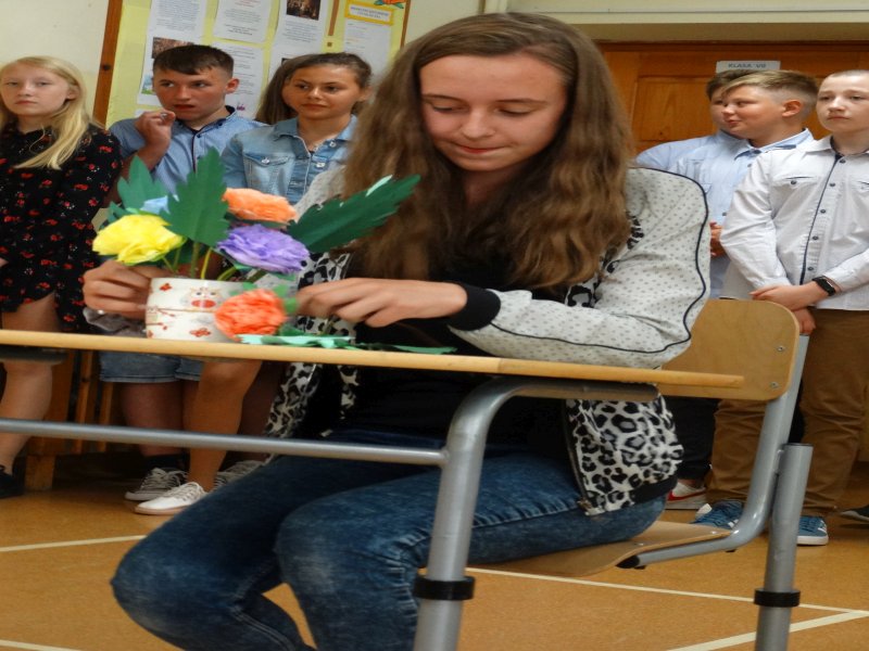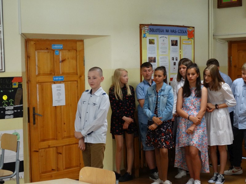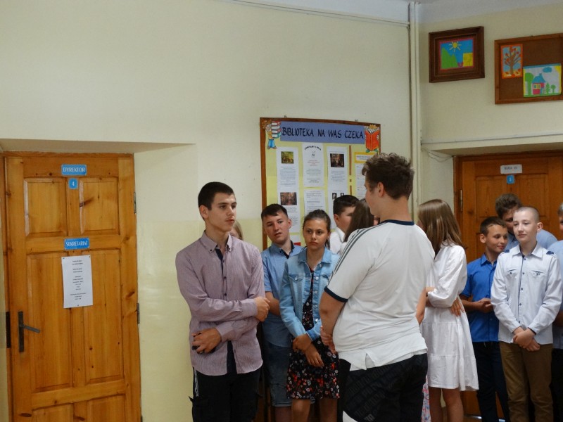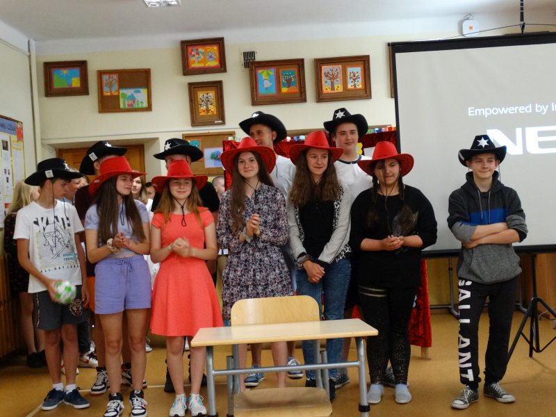 W tym dniu wychowawczyni klasy p.Agata Świeboda wraz z swoją klasą VII pożegnała naszych absolwentów klasy VIII. Jest u nas taka tradycja, że dzień wcześniej absolwenci szkoły są żegnani przez społeczność szkolną na wesoło i humorystycznie. Każdy z nich powiedział coś o sobie i były zadania dla nich do wykonania. Jednym słowem zostali przetestowani z swoich umiejętności i wiadomości. Było trochę emocji i radości ale sobie poradzili z tym dobrze. Na zakończenie spotkania wychowawca klasy 8 p.Filip Malik przedstawił prezentację historyczną o swojej klasie pokazując zdjęcia sprzed wielu lat i było możliwość wspomnień i wzruszeń szczególnie dla absolwentów. Otrzymali też od klasy 7 upominki w postaci kapeluszy ,,kowbojskich”.