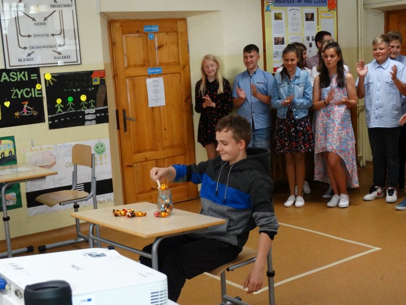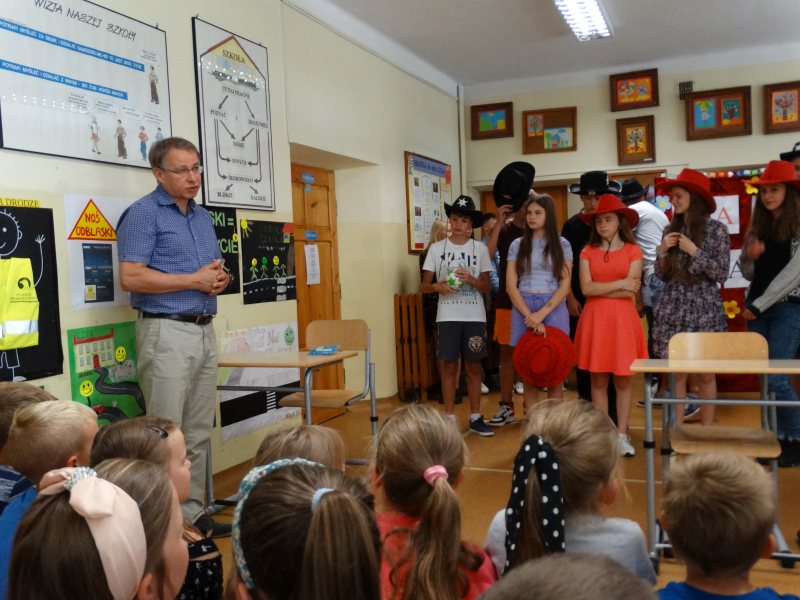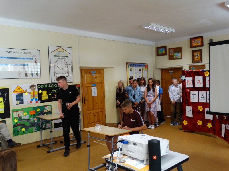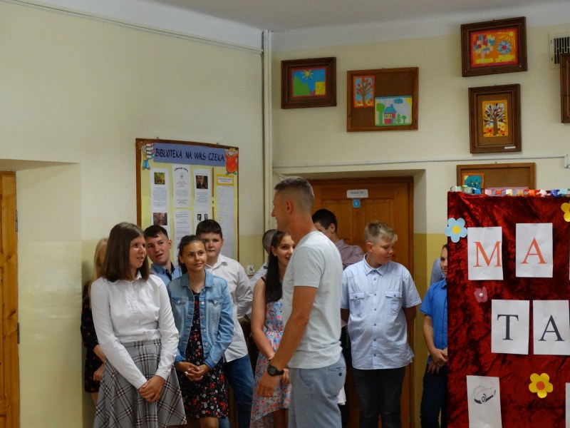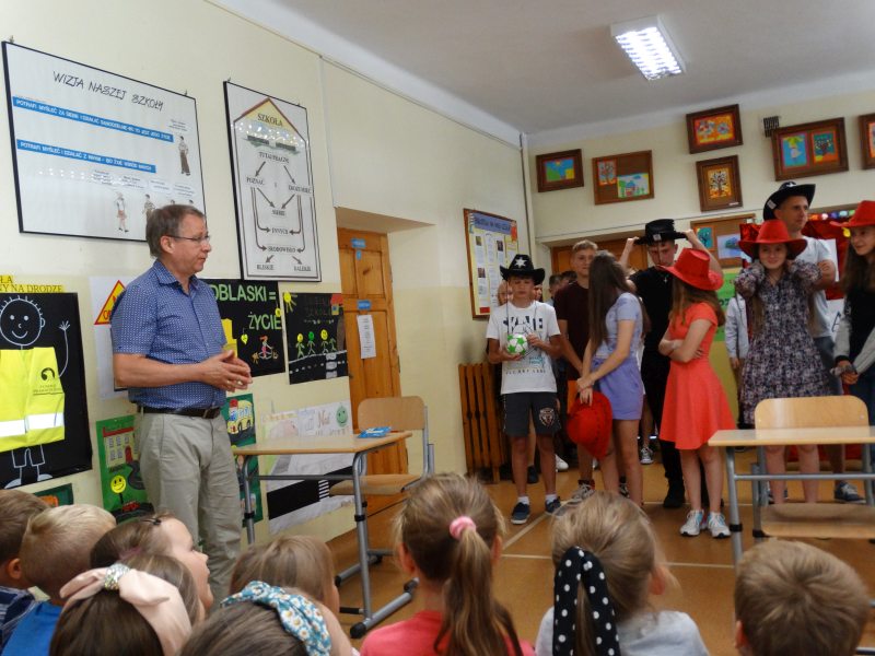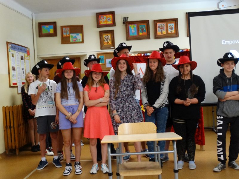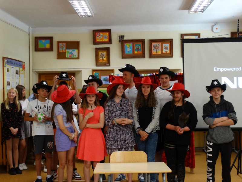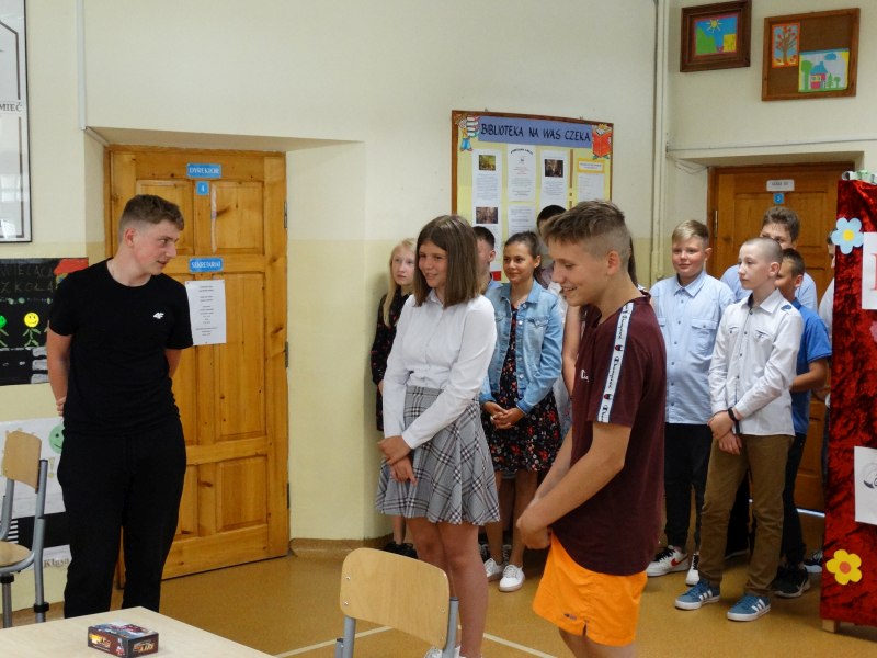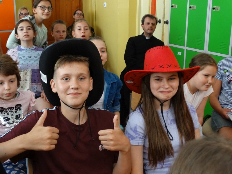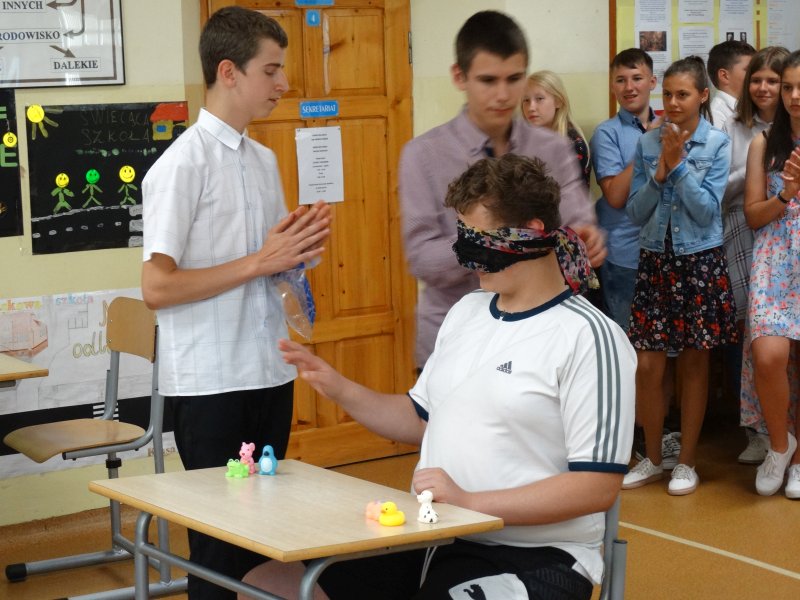 W tym dniu wychowawczyni klasy p.Agata Świeboda wraz z swoją klasą VII pożegnała naszych absolwentów klasy VIII. Jest u nas taka tradycja, że dzień wcześniej absolwenci szkoły są żegnani przez społeczność szkolną na wesoło i humorystycznie. Każdy z nich powiedział coś o sobie i były zadania dla nich do wykonania. Jednym słowem zostali przetestowani z swoich umiejętności i wiadomości. Było trochę emocji i radości ale sobie poradzili z tym dobrze. Na zakończenie spotkania wychowawca klasy 8 p.Filip Malik przedstawił prezentację historyczną o swojej klasie pokazując zdjęcia sprzed wielu lat i było możliwość wspomnień i wzruszeń szczególnie dla absolwentów. Otrzymali też od klasy 7 upominki w postaci kapeluszy ,,kowbojskich”.