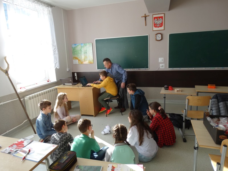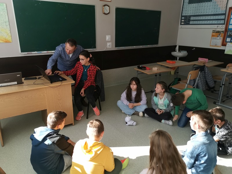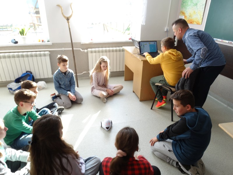 Na lekcji techniki uczniowie klasy V wspólnie z nauczycielem techniki p.Józefem Kuligiem zapoznali się z podstawowymi funkcjami robota edukacyjnego Photon. Mogli nim sterować w różnych kierunkach i wydawać mu komunikaty jak ma się poruszać.