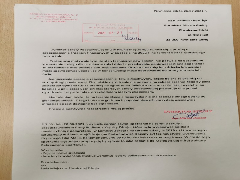 W lipcu 2021 r. napisałem pisma do Burmistrza MiG Piwniczna-Zdrój p.Dariusza Chorużyka i przewodniczącego Rady Miejskiej p.Adama Musialskiego wraz z uzasadnieniem budowy boiska i aktualnymi zdjęciami, które stwarzało zagrożenie dla zdrowia dzieci i uczniów ponieważ były tzw. wybrzuszenia na asfalcie.