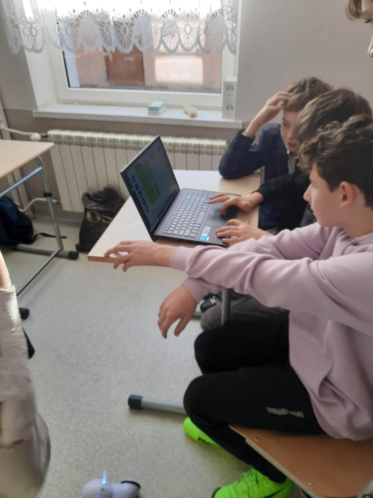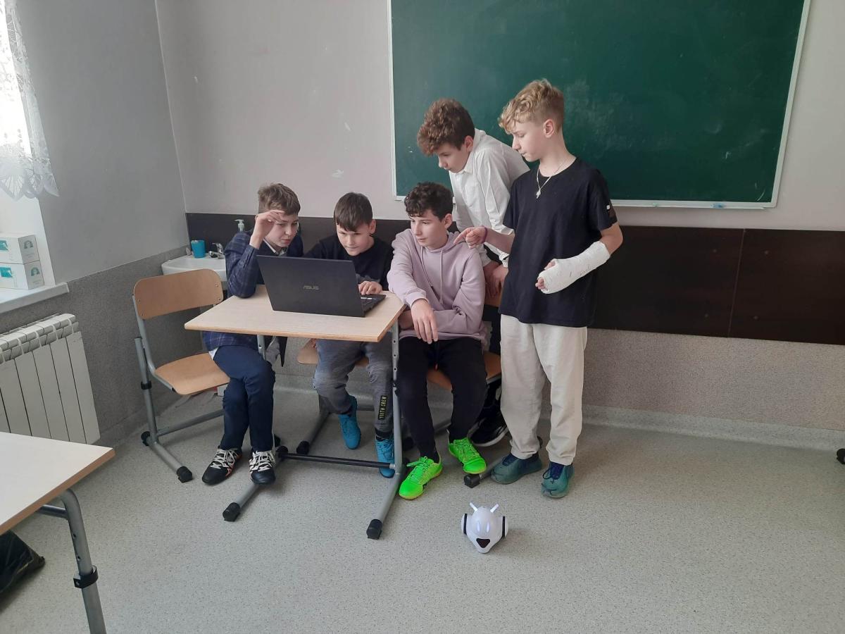 W lutym 2023 r. uczniowie klasy 7 podczas zajęć z wychowawcą uczyli się programować robota edukacyjnego Photon. Lekcja rozpoczęła się od krótkiego pokazu, wykonanego przez wychowawcę. Następnie uczniowie zostali podzieleni na dwie grupy. Pierwsza z nich miała zaprogramować trasę robota z sali lekcyjnej do biblioteki szkolnej, a druga - do pokoju nauczycielskiego. Uczniowie, metodą prób i błędów, bardzo dobrze wywiązali się z powierzonego im zadania. Urządzenie wywarło na nich ogromne wrażenie.