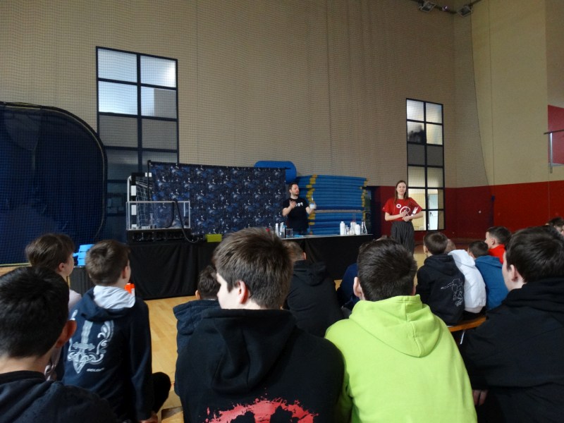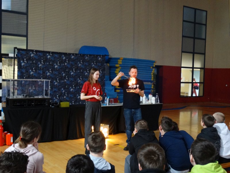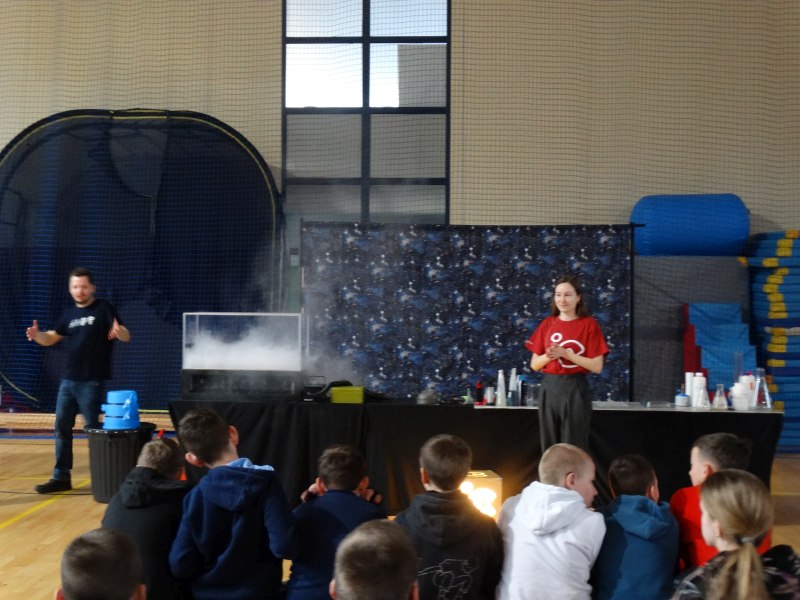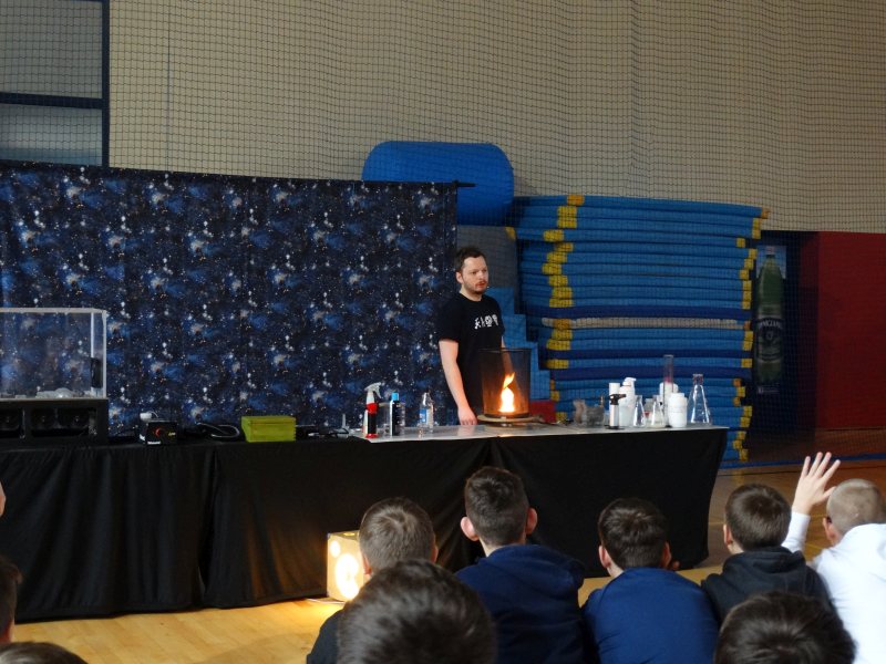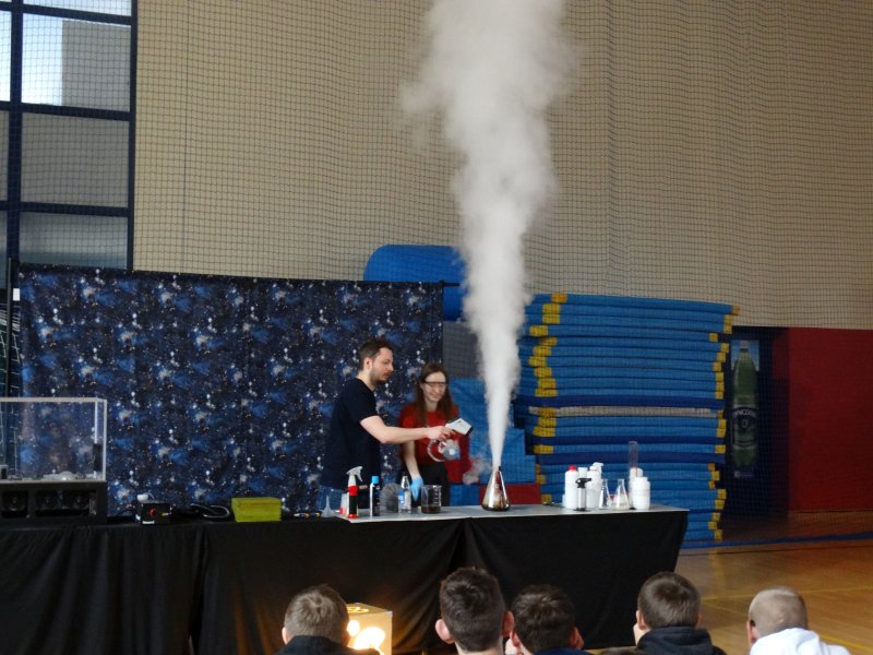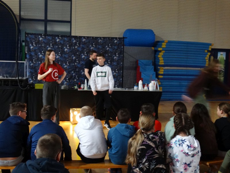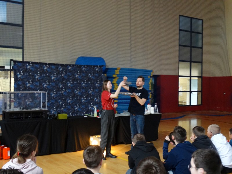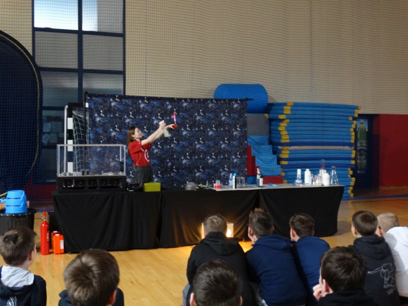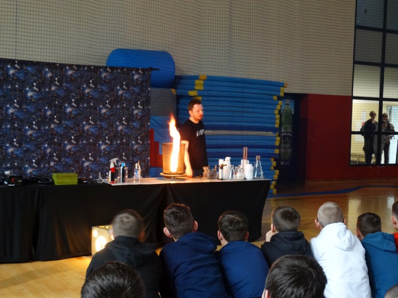 Uczniowie z wielkim zainteresowaniem oglądali pokaz, niektórzy wykazali się dużą wiedzą z zakresu chemii i fizyki.