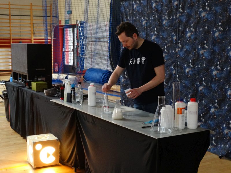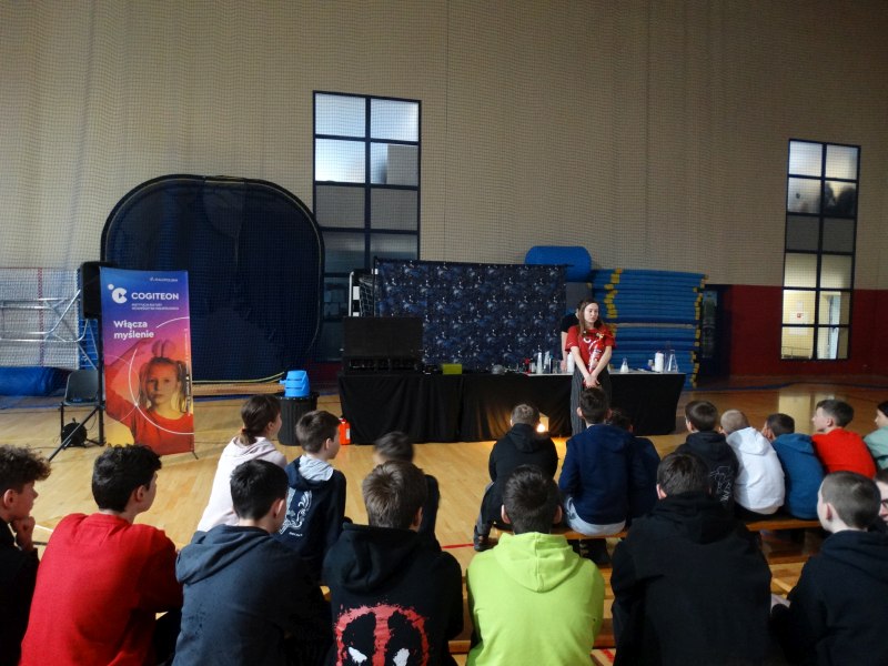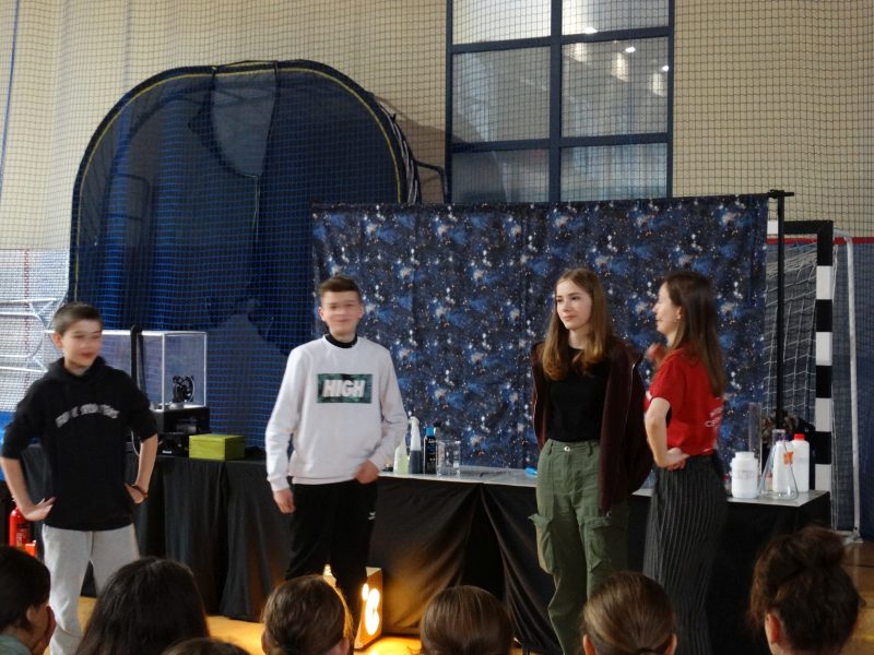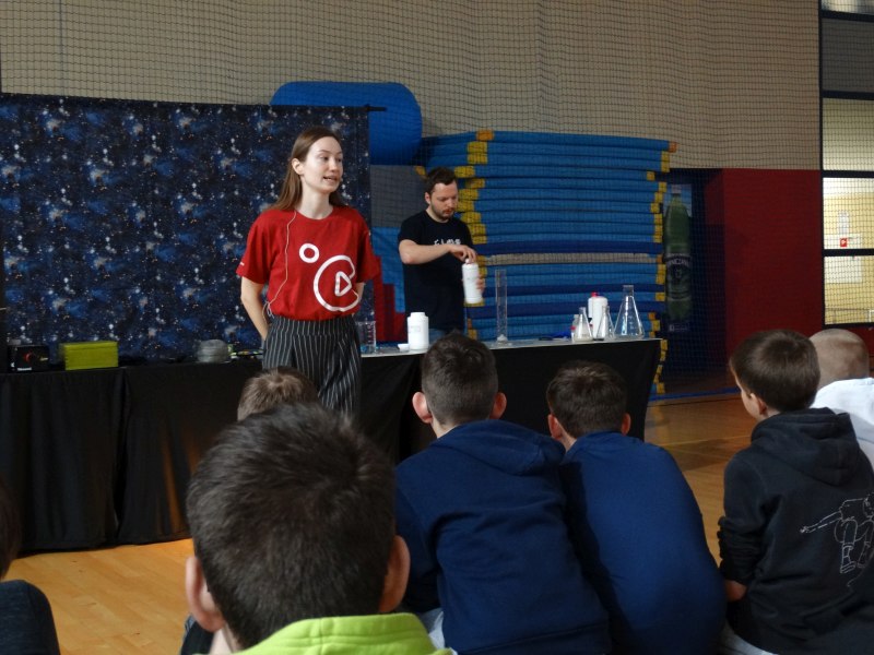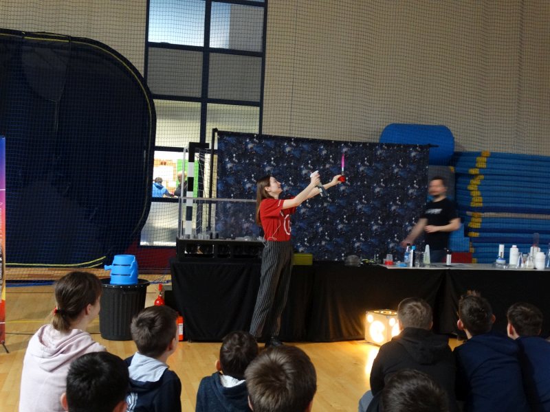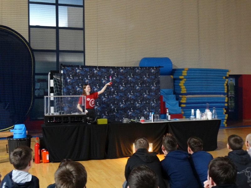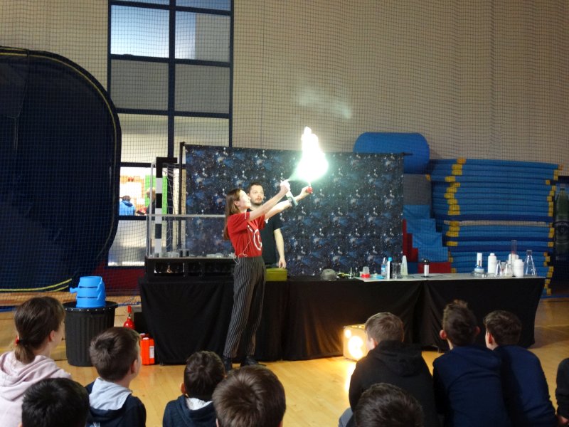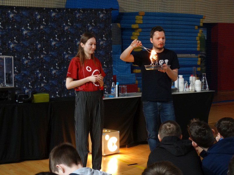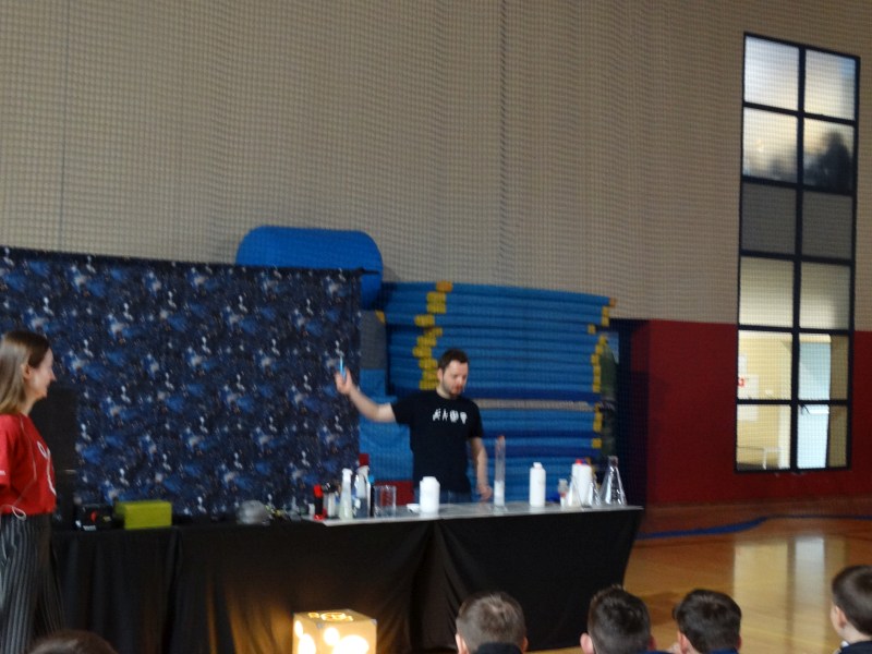 Uczniowie z wielkim zainteresowaniem oglądali pokaz, niektórzy wykazali się dużą wiedzą z zakresu chemii i fizyki.