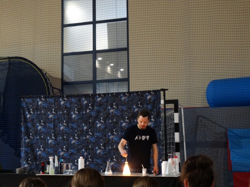 Następnie uczniowie oglądali szereg doświadczeń, które miały dać odpowiedź na postawione wcześniej pytania. Między innymi dowiedzieli się jakie warunki muszą być spełnione, żeby nie zgasł płomień, a jakie, by ugasić pożar, jakie substancje zmieszać, by powstała para wodna i jak powstaje smog.
