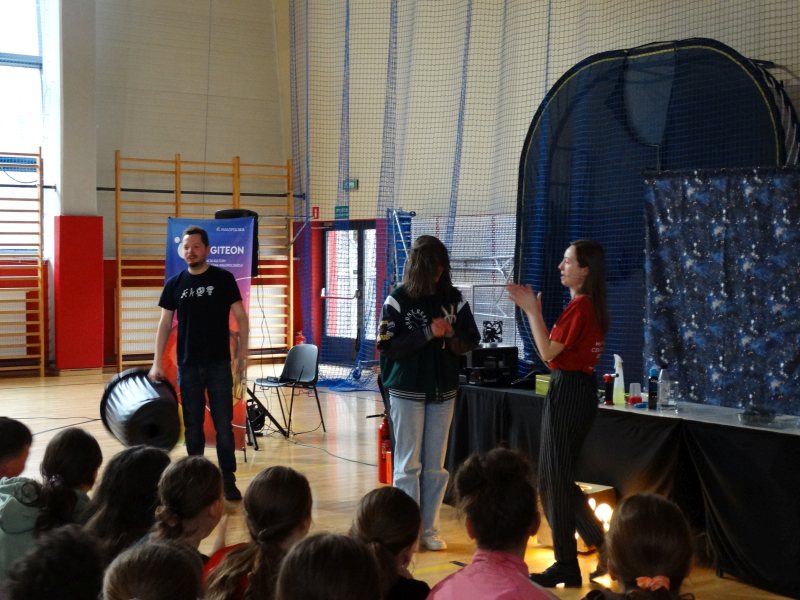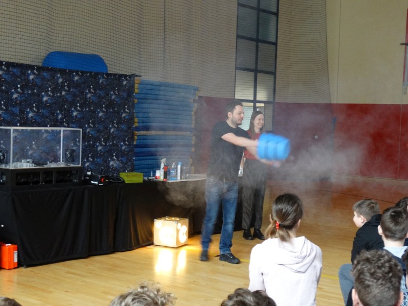 Pokaz rozpoczął się w nietypowy sposób. Uczniowie zobaczyli puste pudełko, a pani prowadząca zajęcia powiedziała: „Zazwyczaj kiedy zaglądamy do pustego pudełka mówimy, że nic w nim nie ma. Czy rzeczywiście tak jest? Cały czas poruszamy się w mieszaninie, której nie widać, która przez nas przepływa, porusza się, może przybierać kształt, a nawet niszczyć duże obiekty! A skoro jest mieszaniną, to znaczy, że składa się z kilku rzeczy. I nie są to tylko gazy. Co takiego wisi w powietrzu, skąd się bierze i jaki ma wpływ na nas i na nasze otoczenie?”.