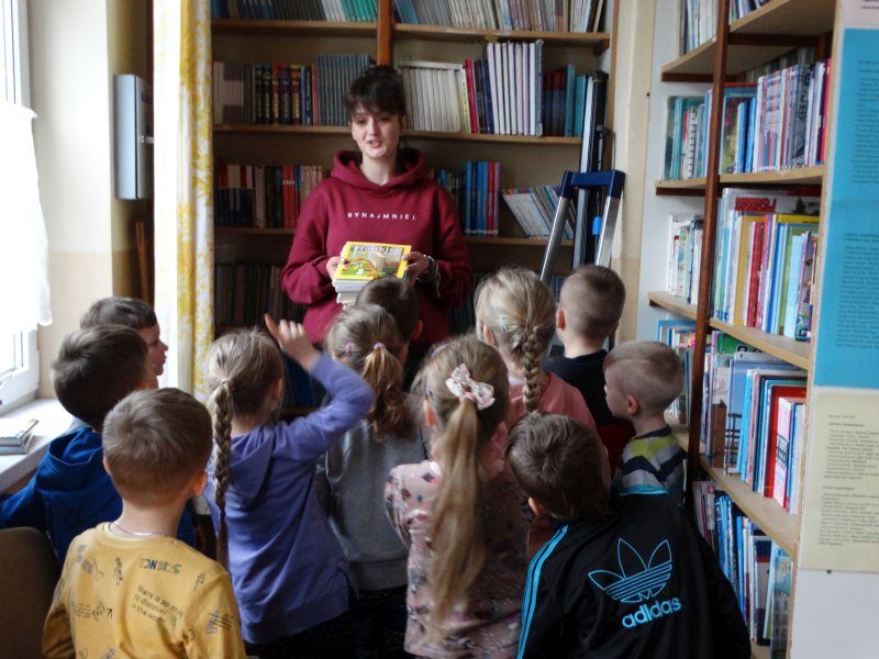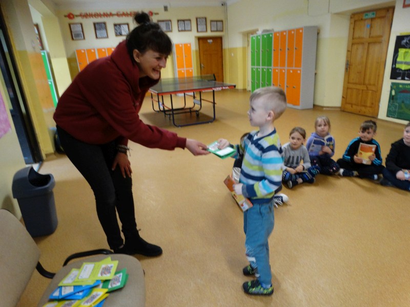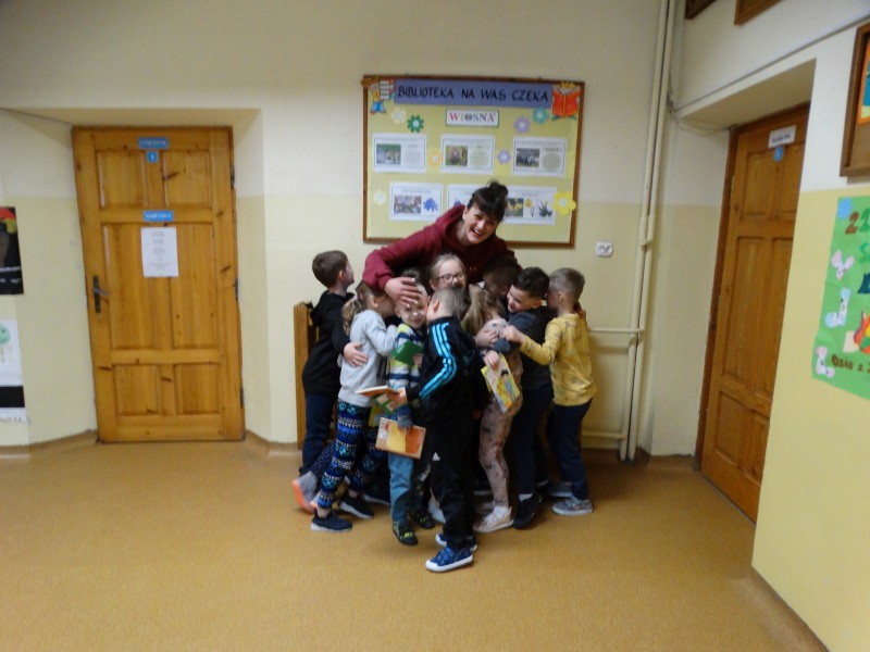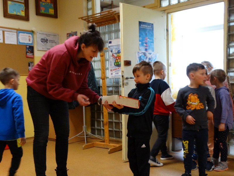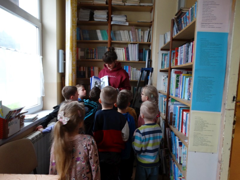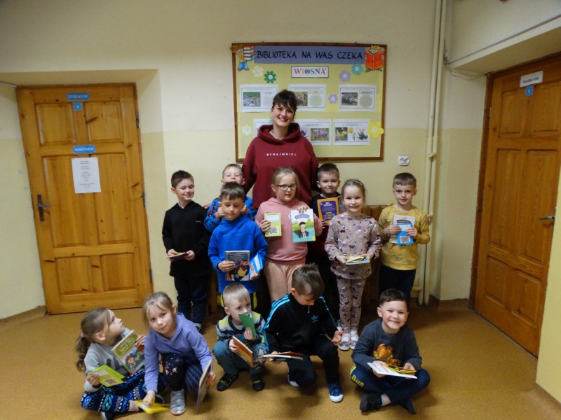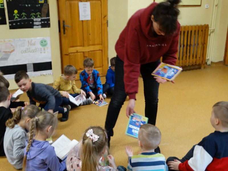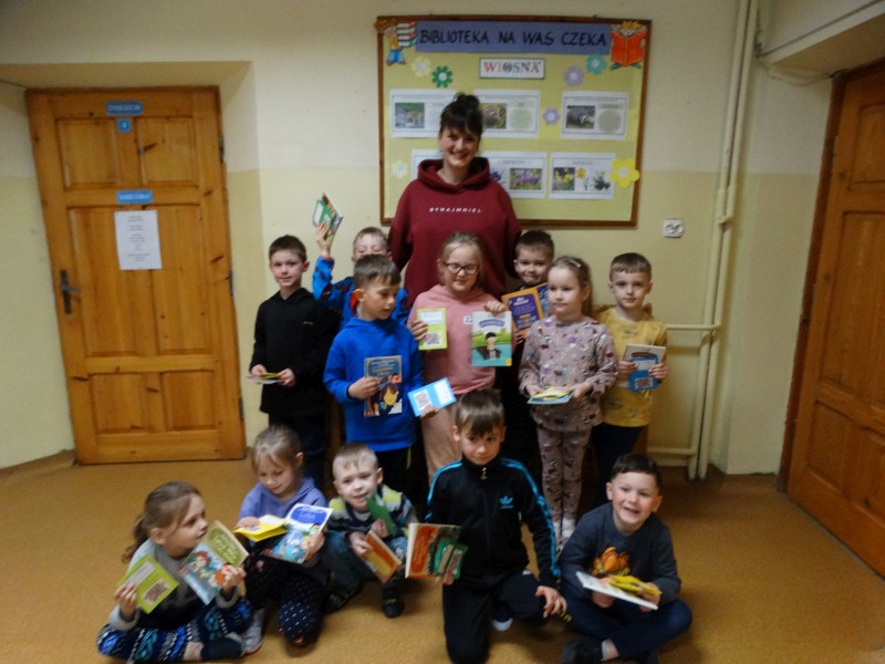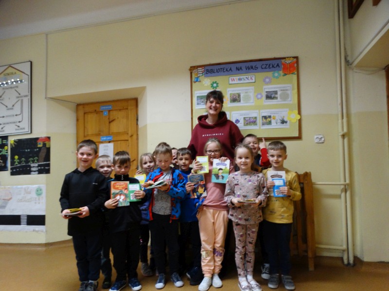 Dnia 17.04.2023r. bibliotekę szkolną odwiedziły dzieci z oddziału ,,0” pod opieką Pani Marii Ściurki. Spotkanie dotyczyło przybliżenia najmłodszym uczniom specyfiki pracy bibliotekarza, zaprezentowania zbiorów bibliotecznych. Obfitowało również w różnego rodzaju zagadki oraz konkursy. Dzieci miały możliwość zapoznania się z książeczkami od których będą zaczynać swoją przygodę z czytaniem. Zobaczyły również jak wygląda karta czytelnika, jakie informacje zawiera. W trakcie zajęć miały również możliwość sprawdzenia swoich sił poprzez próbę podniesienia największej i najcięższej książki znajdującej się w bibliotece – Słownika Języka Polskiego. Spotkanie zakończone zostało wręczeniem upominków oraz wspólnym, pamiątkowym zdjęciem.