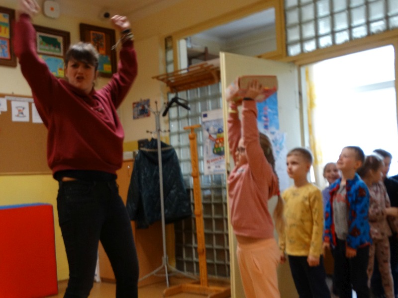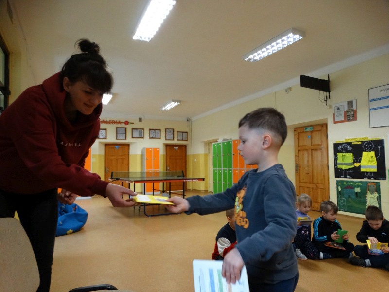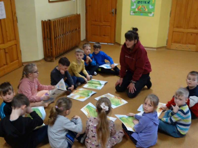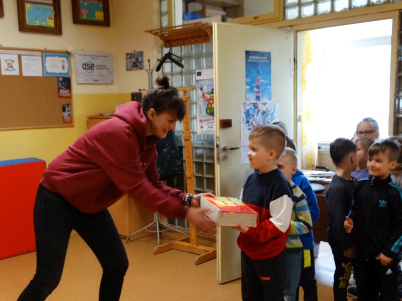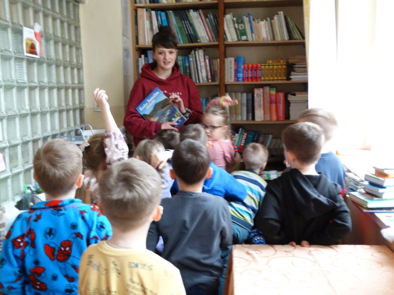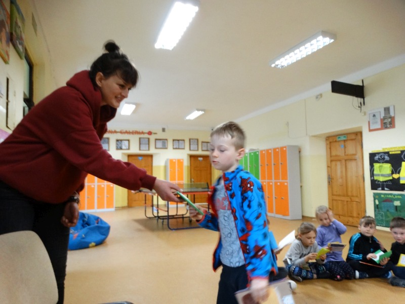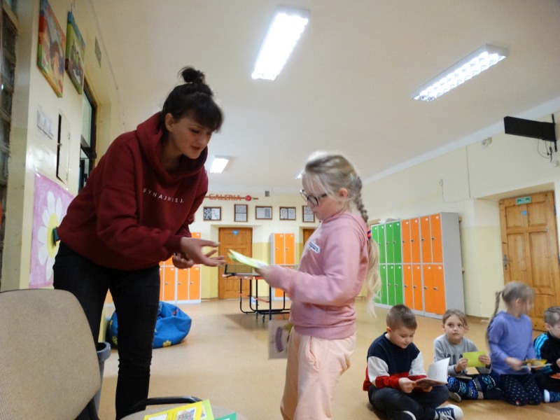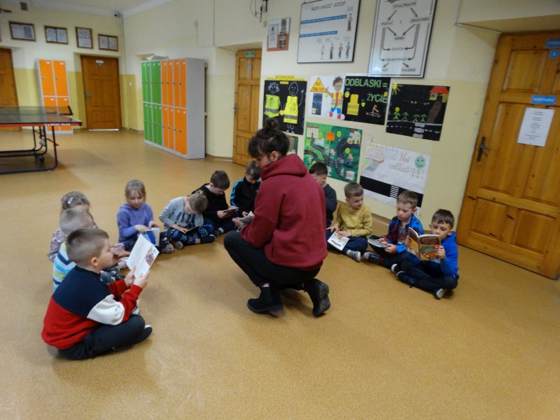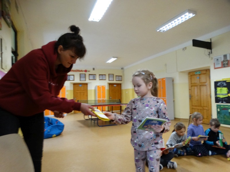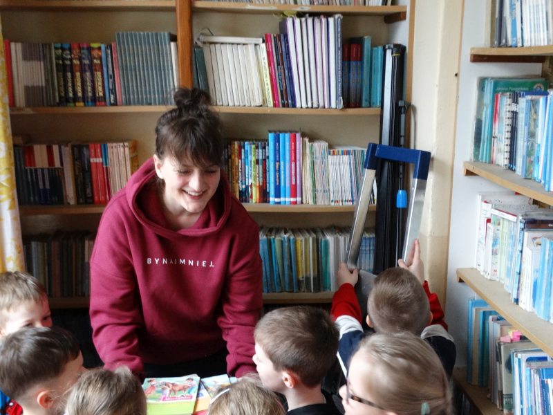 Dnia 17.04.2023r. bibliotekę szkolną odwiedziły dzieci z oddziału ,,0” pod opieką Pani Marii Ściurki. Spotkanie dotyczyło przybliżenia najmłodszym uczniom specyfiki pracy bibliotekarza, zaprezentowania zbiorów bibliotecznych. Obfitowało również w różnego rodzaju zagadki oraz konkursy. Dzieci miały możliwość zapoznania się z książeczkami od których będą zaczynać swoją przygodę z czytaniem. Zobaczyły również jak wygląda karta czytelnika, jakie informacje zawiera. W trakcie zajęć miały również możliwość sprawdzenia swoich sił poprzez próbę podniesienia największej i najcięższej książki znajdującej się w bibliotece – Słownika Języka Polskiego. Spotkanie zakończone zostało wręczeniem upominków oraz wspólnym, pamiątkowym zdjęciem.