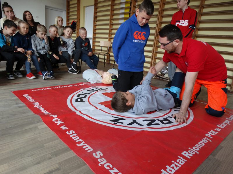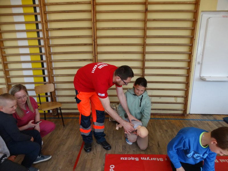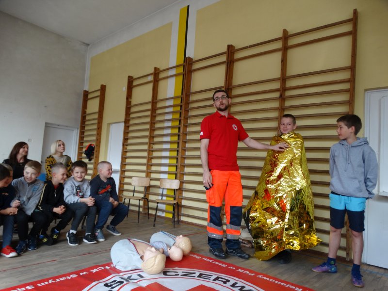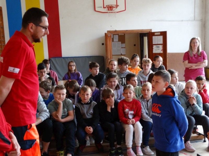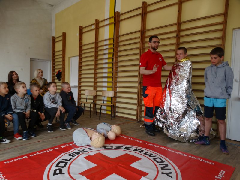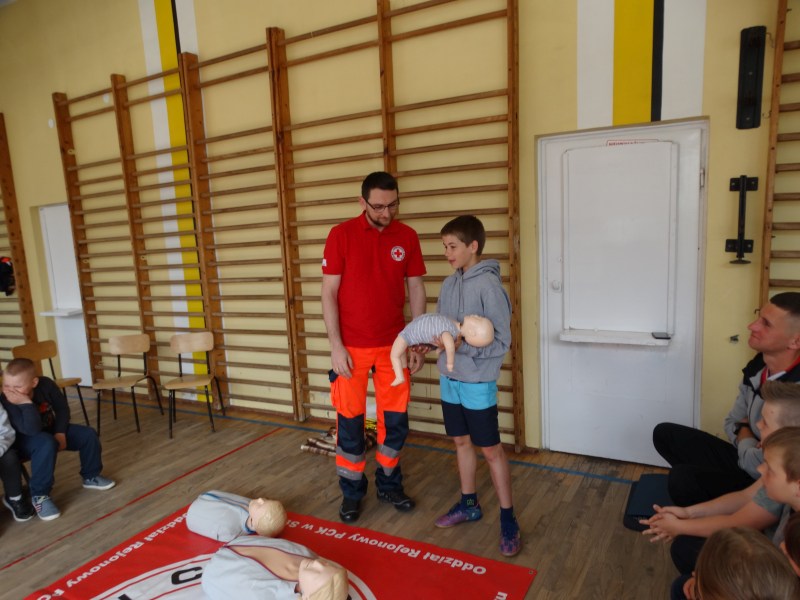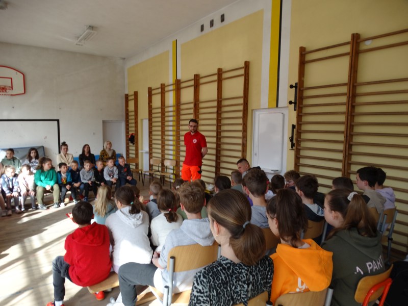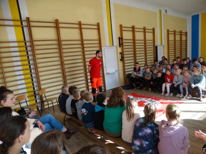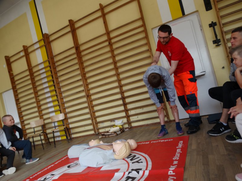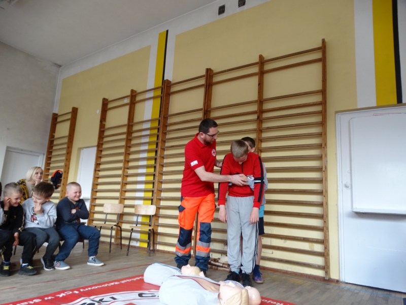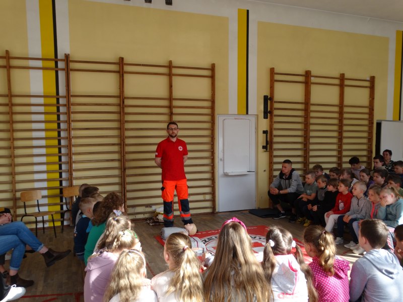 Dnia 12.05.2023 r. w naszej szkole odbyło się spotkanie z ratownikiem medycznym – Panem Mateuszem Bołozem.Udział w nim wzięli uczniowie klas I-VIII. Prowadzący pokazywał w jaki sposób należy udzielać pomocy przedmedycznej dorosłym, dzieciom, a także niemowlętom. Pokaz odbywał się z wykorzystaniem sprzętu medycznego oraz manekinów, tzw. fantomów medycznych. Ratownik w jasny i klarowny sposób zdradzał tajniki udzielania pierwszej pomocy. Uczniowie również wykazali duże zainteresowanie oraz wiedzę. Na szczególną uwagę zasługuje uczeń klasy VI – Oskar Suchowian- Szaflarski, a także klasy VII – Wojciech Gumulak. Chłopcy dali dowód swojej rozległej wiedzy na temat sposób udzielania pierwszej pomocy przedmedycznej.