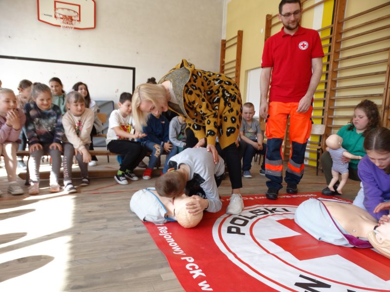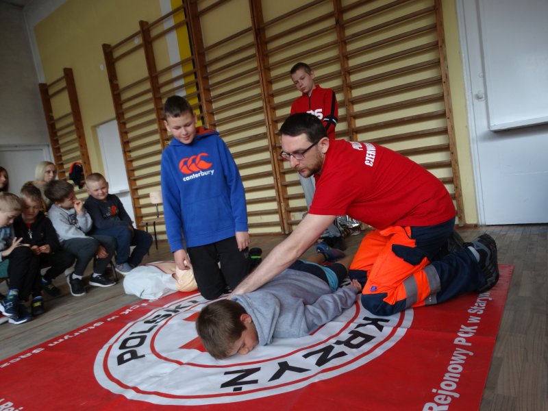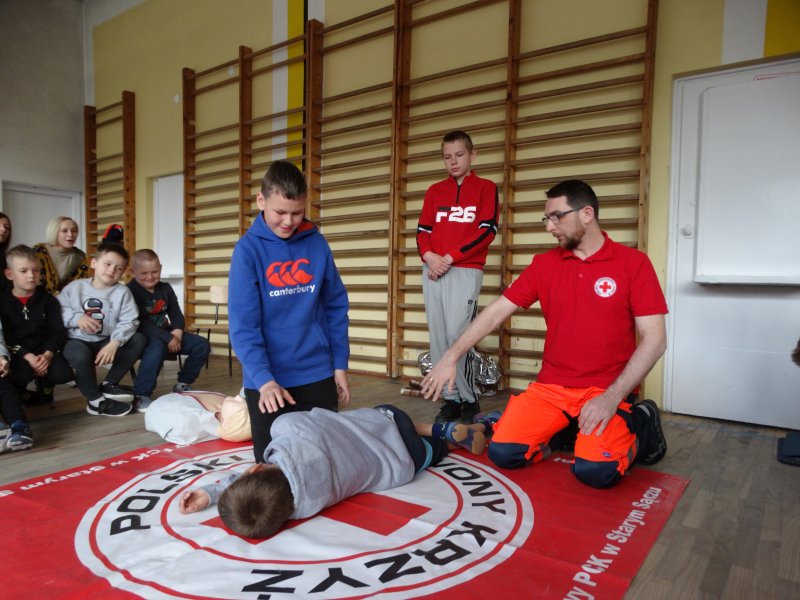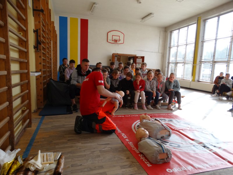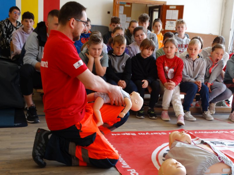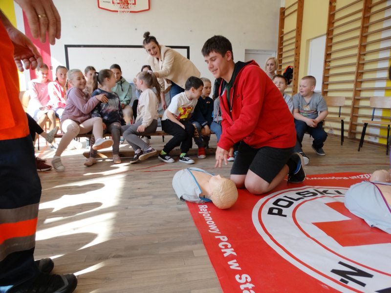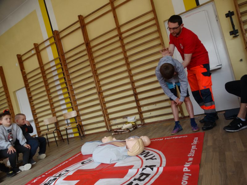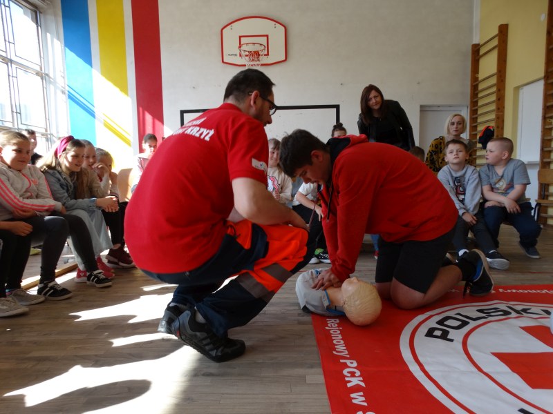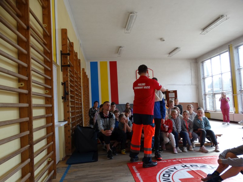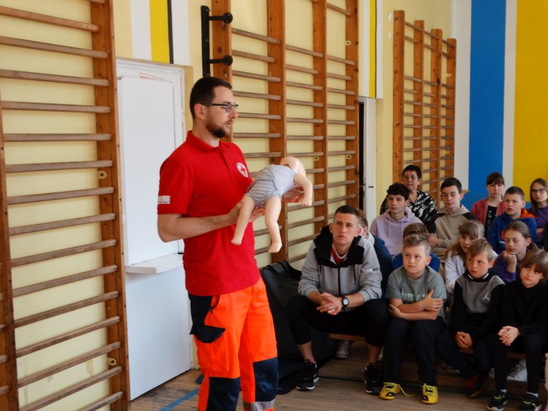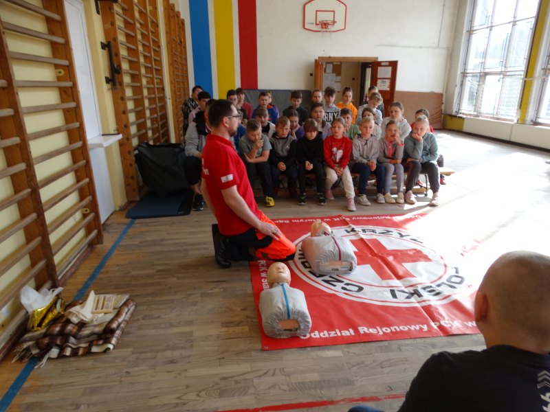 Dnia 12.05.2023 r. w naszej szkole odbyło się spotkanie z ratownikiem medycznym – Panem Mateuszem Bołozem.Udział w nim wzięli uczniowie klas I-VIII. Prowadzący pokazywał w jaki sposób należy udzielać pomocy przedmedycznej dorosłym, dzieciom, a także niemowlętom. Pokaz odbywał się z wykorzystaniem sprzętu medycznego oraz manekinów, tzw. fantomów medycznych. Ratownik w jasny i klarowny sposób zdradzał tajniki udzielania pierwszej pomocy. Uczniowie również wykazali duże zainteresowanie oraz wiedzę. Na szczególną uwagę zasługuje uczeń klasy VI – Oskar Suchowian- Szaflarski, a także klasy VII – Wojciech Gumulak. Chłopcy dali dowód swojej rozległej wiedzy na temat sposób udzielania pierwszej pomocy przedmedycznej.