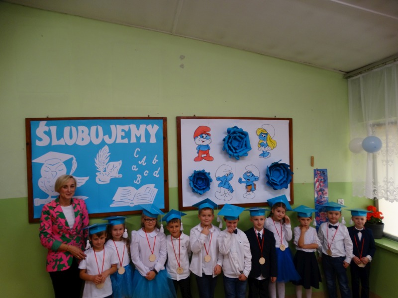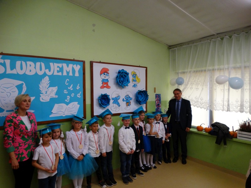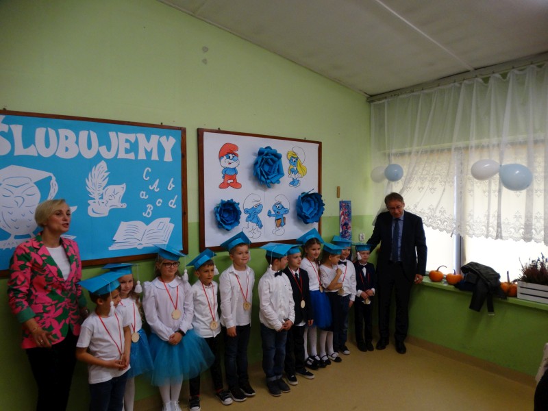 Dnia 31 października odbyła się w naszej szkole uroczystość Ślubowania i Pasowania na Ucznia Klasy Pierwszej. To bardzo ważne wydarzenie nie tylko dla najmłodszych, ale również dla ich rodziców. Zanim pierwszoklasiści zostali przyjęci do grona społeczności szkolnej musieli zaprezentować to, czego się już w szkole nauczyli. Pięknie, odświętnie ubrani, przejęci przystąpili do zaprezentowania swoich umiejętności. Dzieci pięknie śpiewały piosenki, recytowały wiersze i odpowiadały na szereg bardzo ważnych pytań. Wszystkich zebranych zachwycił również taniec w wykonaniu uczniów. Po zakończonej prezentacji rodzice i pan dyrektor zgodnie stwierdzili, iż wszystkie dzieci wspaniale zdały „egzamin pierwszoklasisty”.