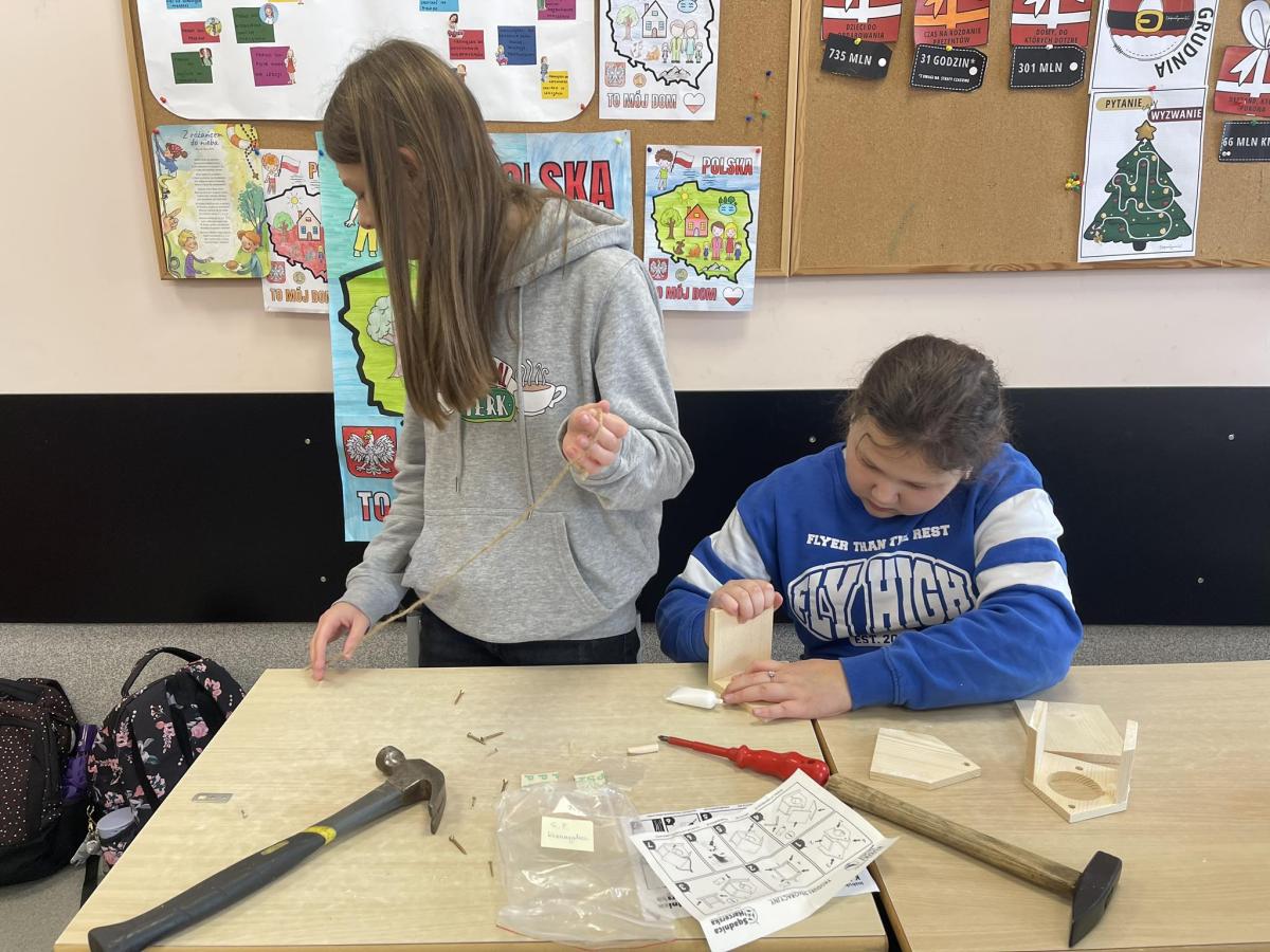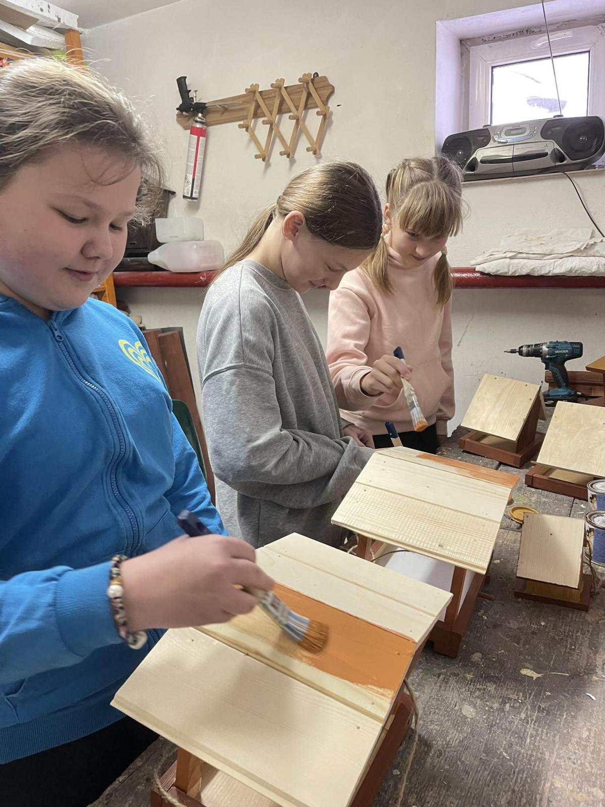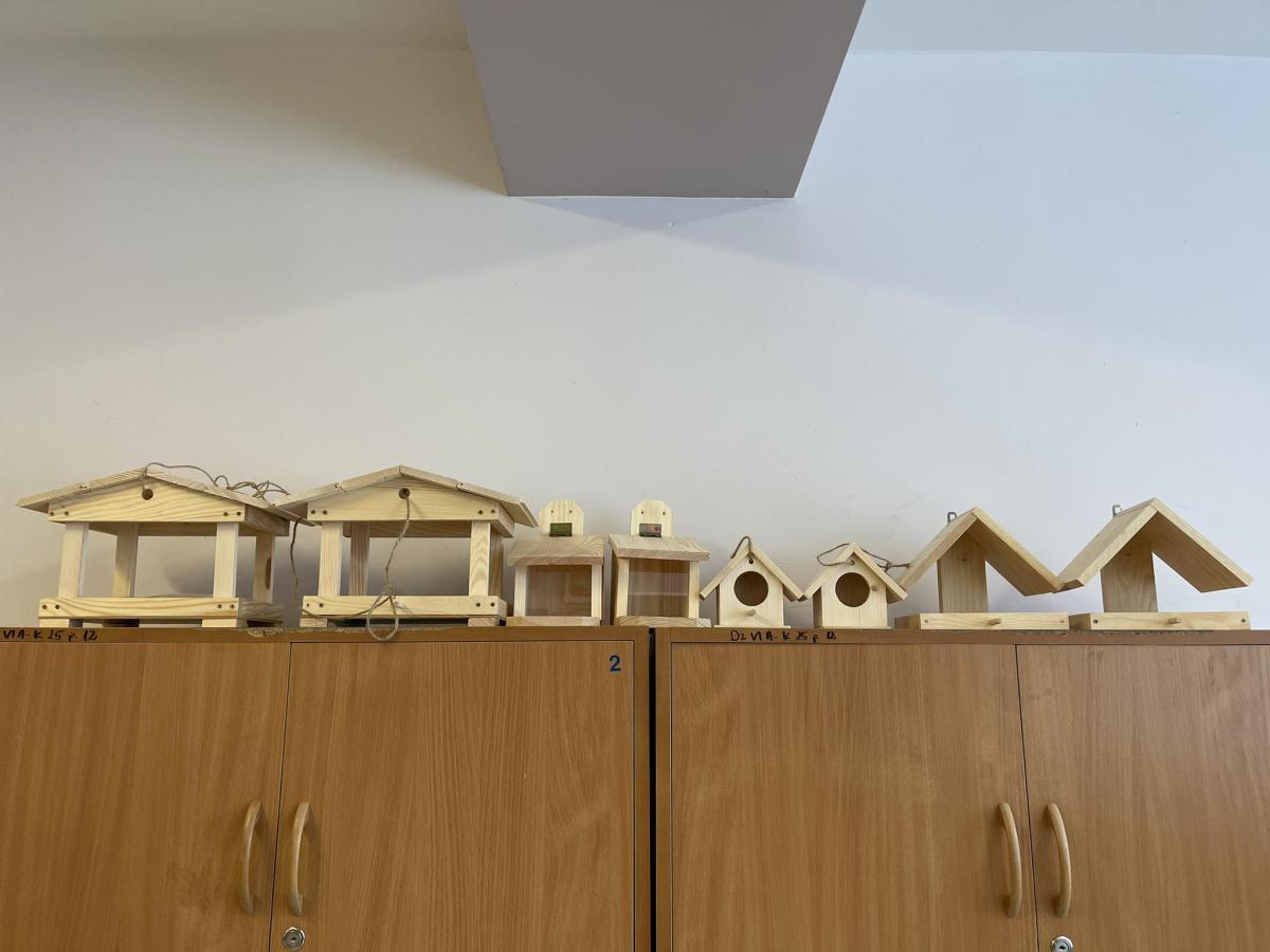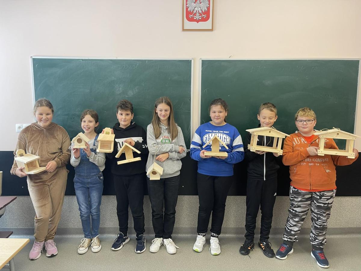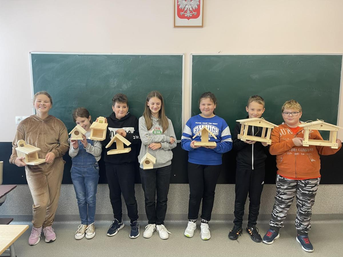 Nasza szkoła otrzymała kilka takich karmników i na lekcjach techniki i plastyki uczniowie pod opieką nauczycielki p. Moniki Łączek-Bołoz składali je w całość i malowali, a konserwator szkoły p. Jakub Gumulak nadzorował to i montował je na drzewach.